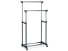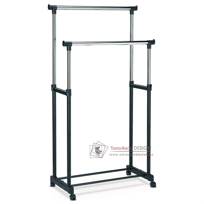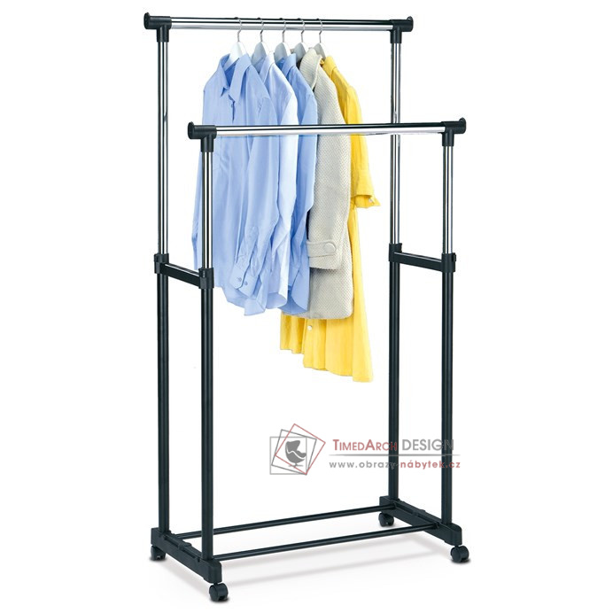 Pojízdný věšák s kolečky a dvěma závěsnými výškově nastavitelnými tyčemi v provedení nerezový kov + černý plast.