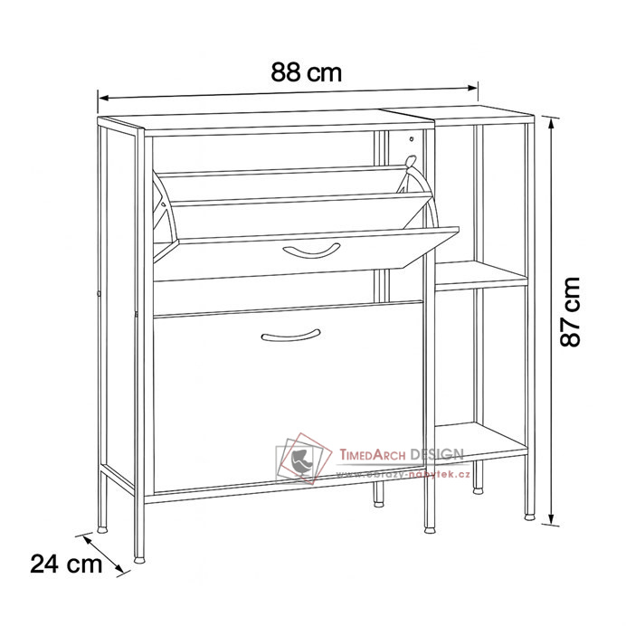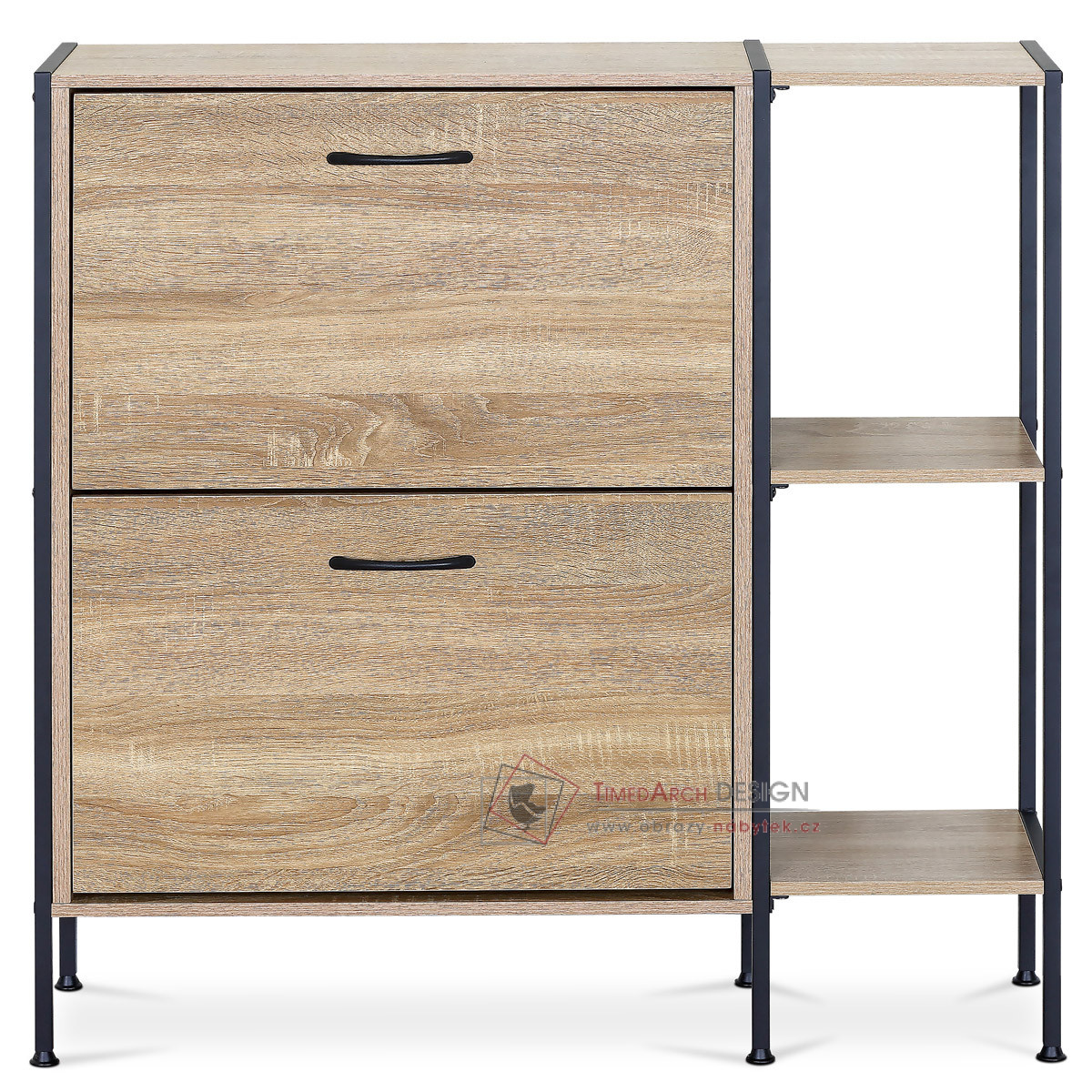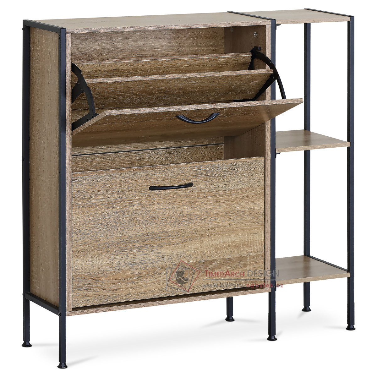 Je vyroben z MDF desek s povrchovou úpravou v odstínech přírodního dřeva, která je snadno udržovatelná. Nabízí dvě přihrádky s výklopnými dvířky pro uložení obuvi a tři otevřené police na doplňky nebo dekorace. Černé kovové nohy a úchytky dodávají botníku stabilitu a industriální vzhled. Kompaktní rozměry umožňují umístění do předsíní i menších prostor.