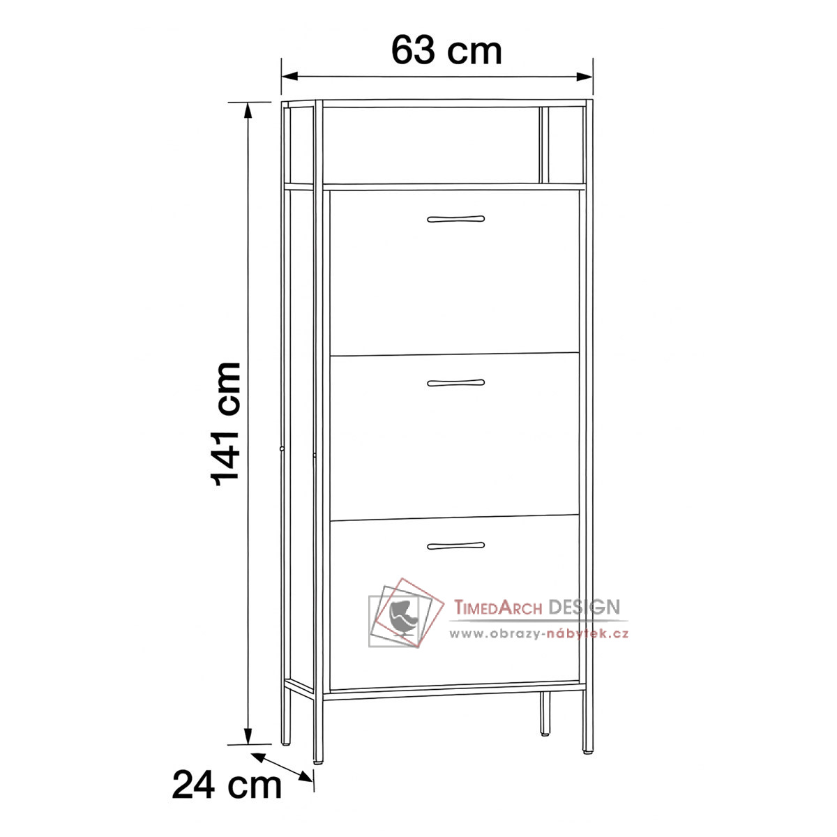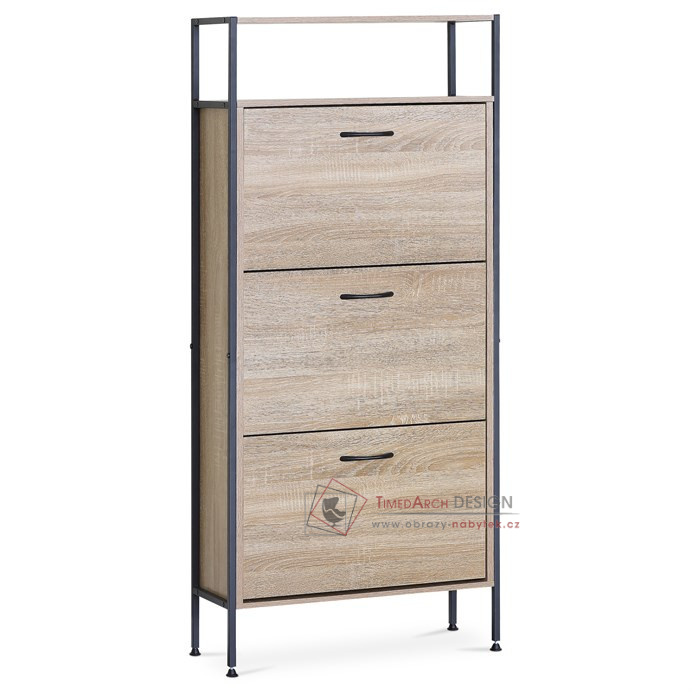 Desky jsou vyrobeny z MDF v dekoru dub, který přináší přírodní odstíny a decentní strukturu dřeva. Stabilní kovová podnož zajišťuje pevnou oporu a lehkost celkového provedení. Každá přihrádka je opatřena černou úzkou úchytkou pro snadné otevírání a zavírání. Kompaktní rozměry umožňují umístění do předsíně či chodby, kde efektivně využije prostor a udrží pořádek.