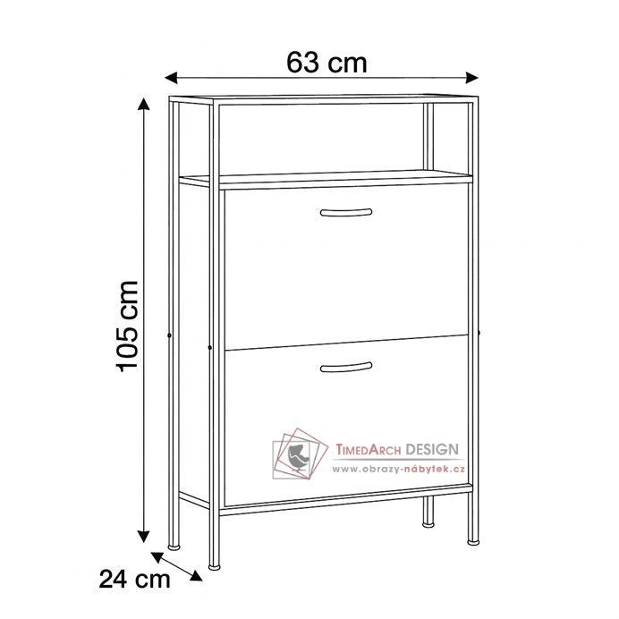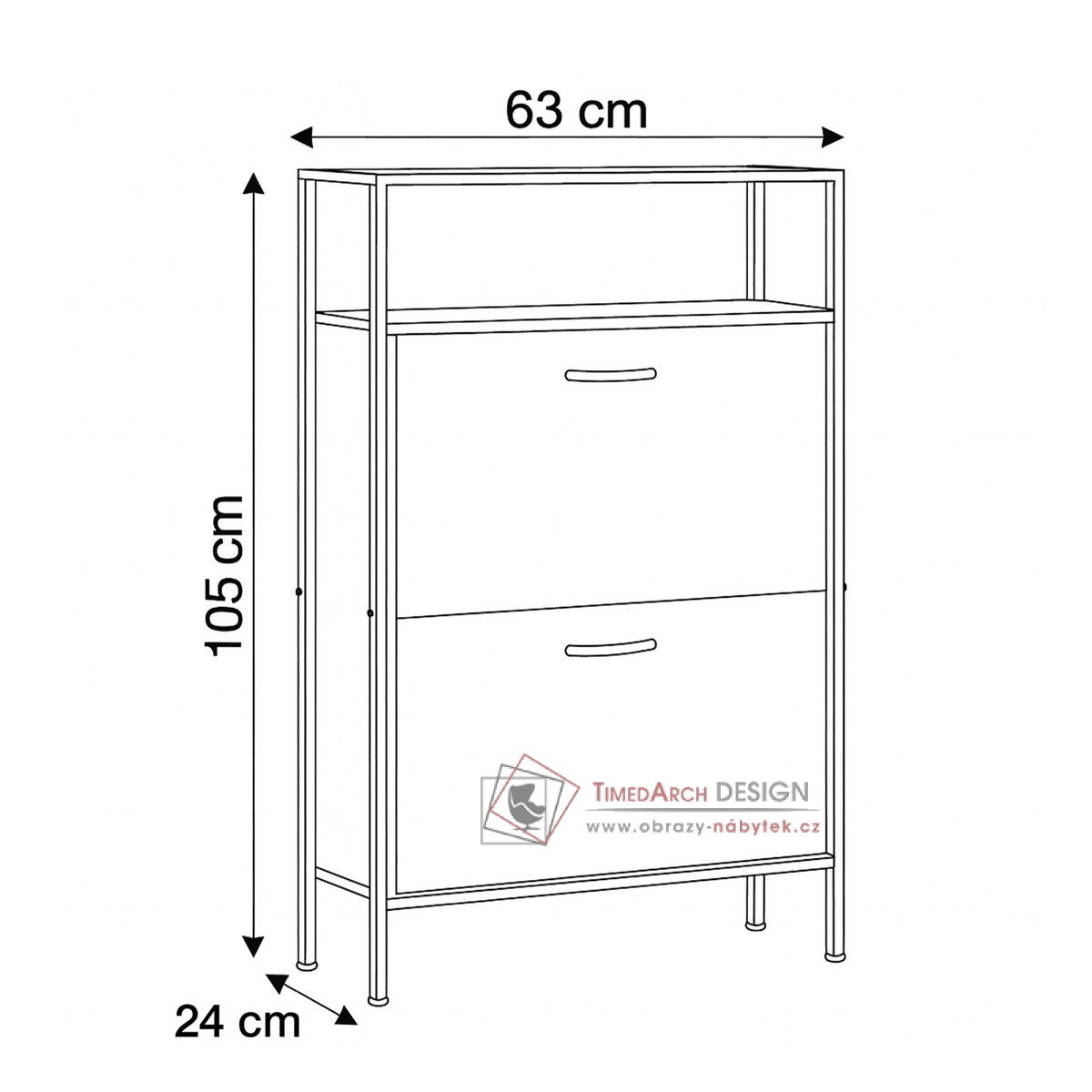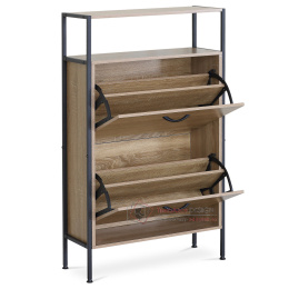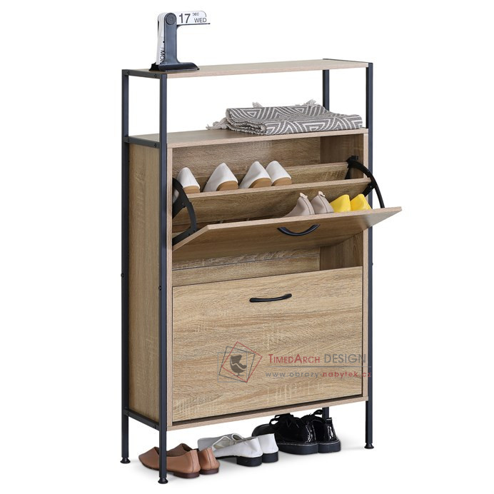 Jeho desky jsou vyrobeny z MDF s dekorativním povrchem v odstínu dub, který přináší přírodní vzhled a snadnou údržbu. Stabilní kovová konstrukce v černé barvě zajišťuje pevnost a dlouhou životnost, zatímco úzké nožky umožňují snadné čištění pod botníkem. Dvě prostorné přihrádky s černými úchytkami poskytují dostatek místa pro uložení více párů bot, a horní police může sloužit k odkládání drobných předmětů nebo dekorací. Kompaktní rozměry botníku umožňují jeho umístění i do menších prostor.