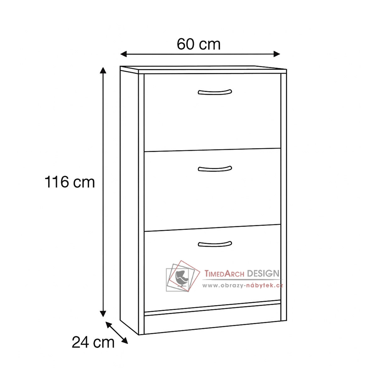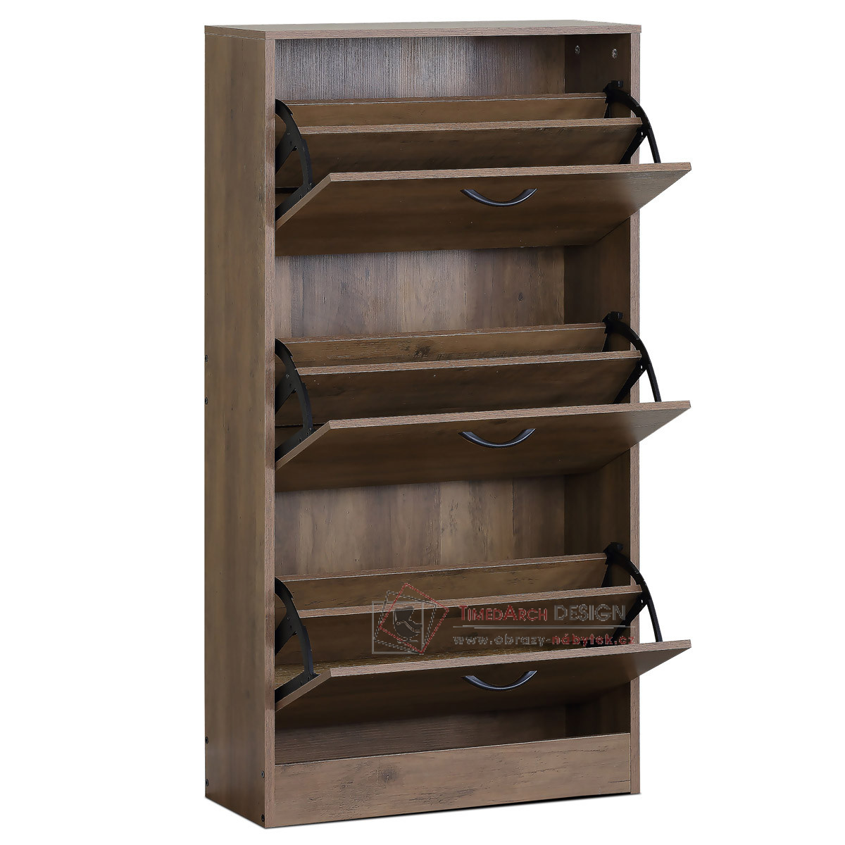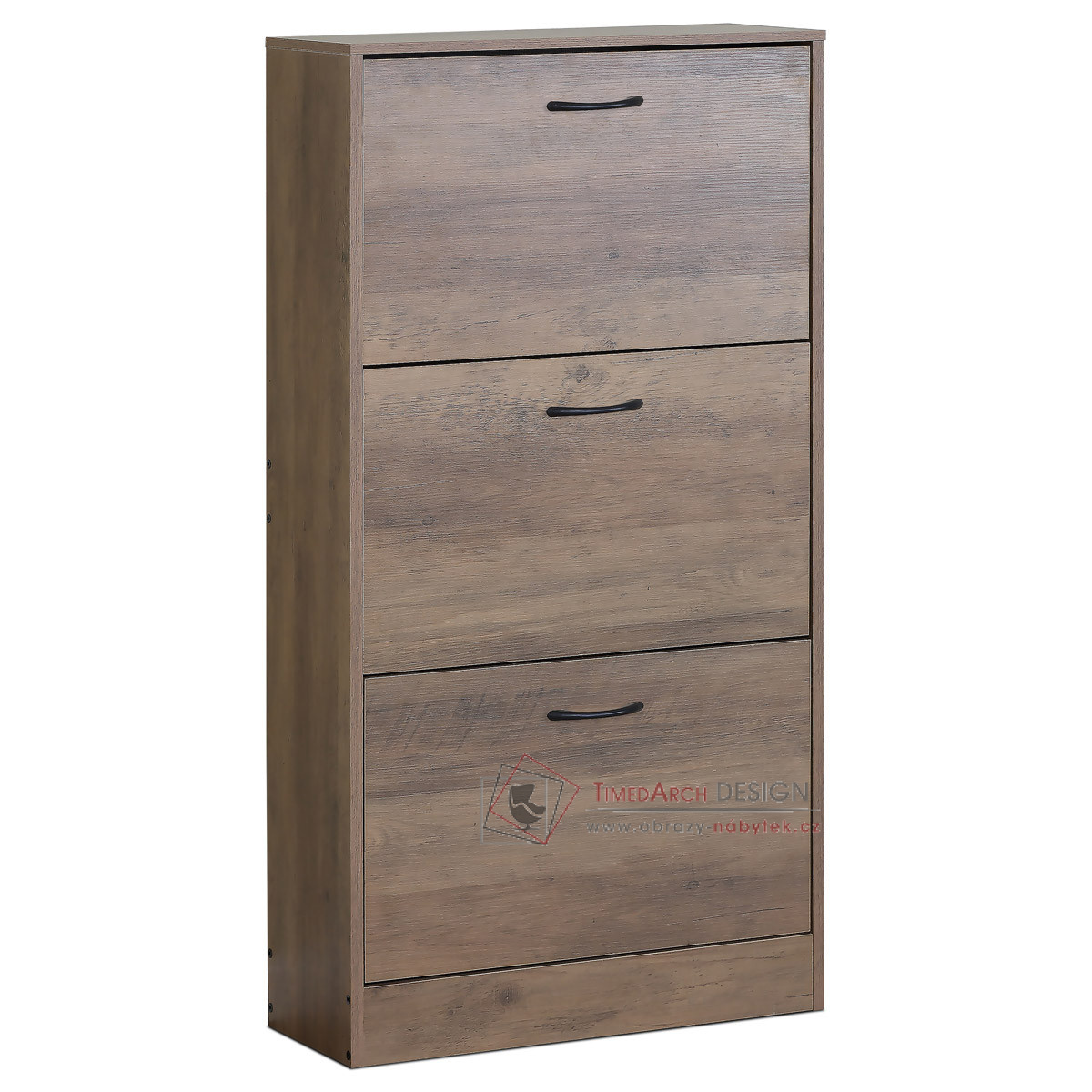 Každá přihrádka nabízí dostatek prostoru pro uskladnění obuvi a je opatřena černými kovovými úchytkami pro snadné otevírání. Kompaktní rozměry botníku umožňují jeho umístění i do menších prostor, přičemž pevná konstrukce zajišťuje stabilitu a dlouhou životnost. Praktické řešení v podobě tří samostatných přihrádek pomáhá udržet pořádek a přehlednost v domácnosti. Botník je vhodný do předsíní, chodeb či šaten, kde efektivně využije dostupné místo.