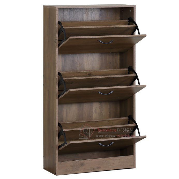 Botník s třemi přihrádkami v dekoru dub je vyroben z MDF desek s povrchovou úpravou, která napodobuje přirozenou strukturu dřeva.