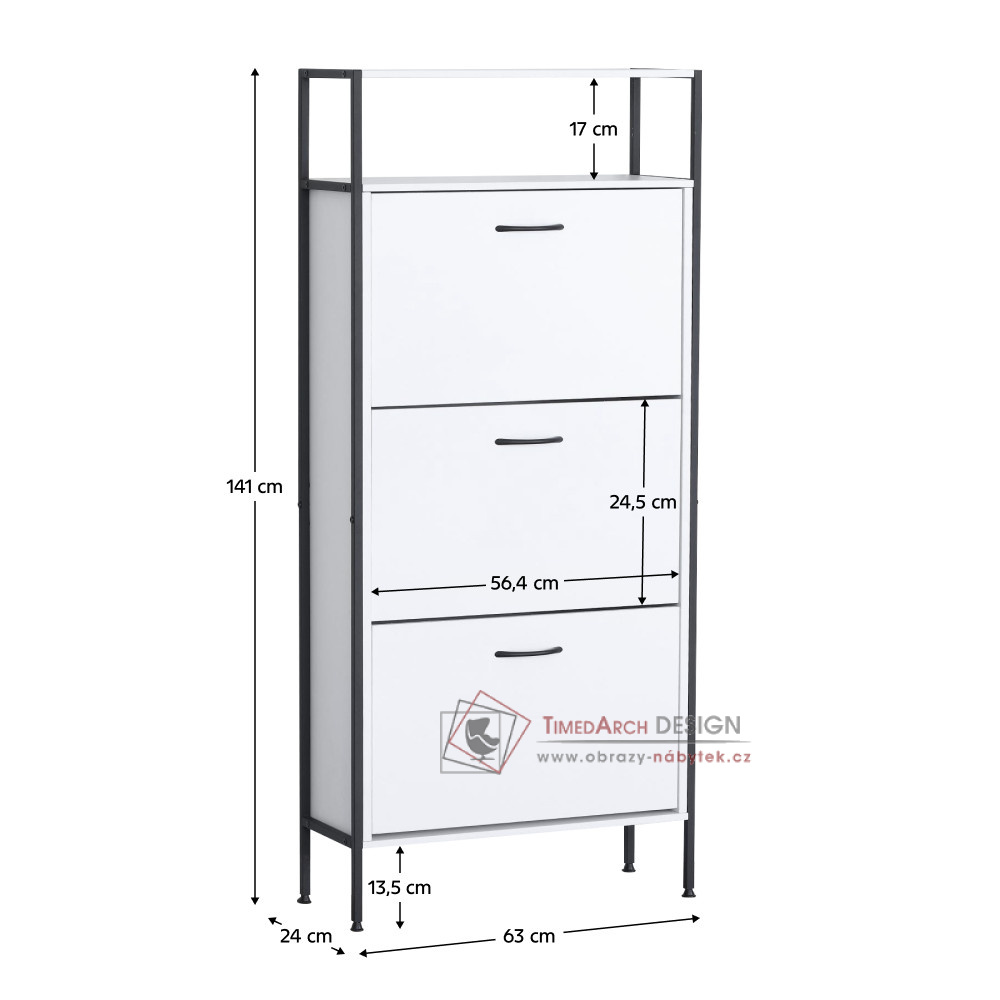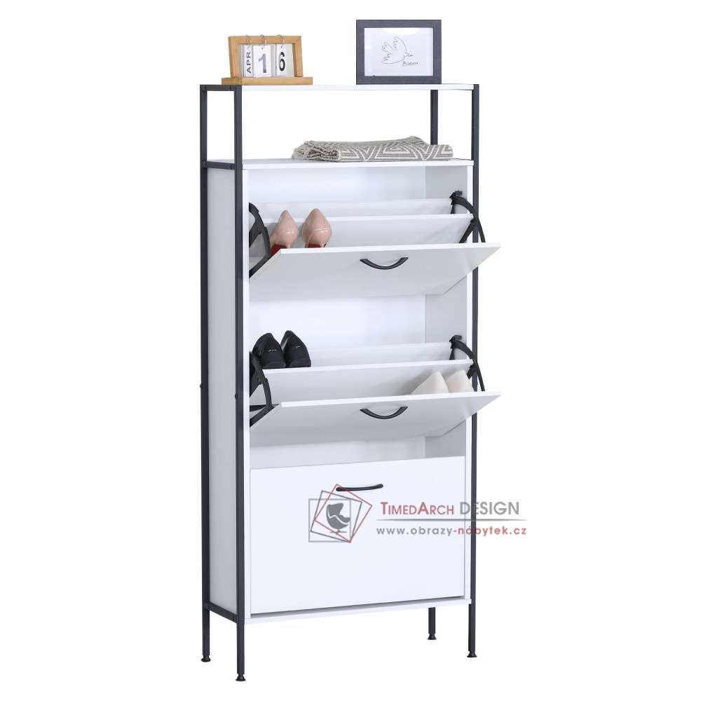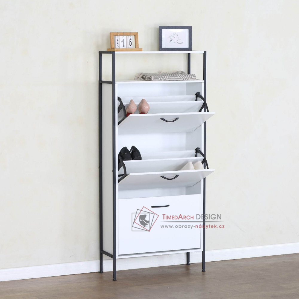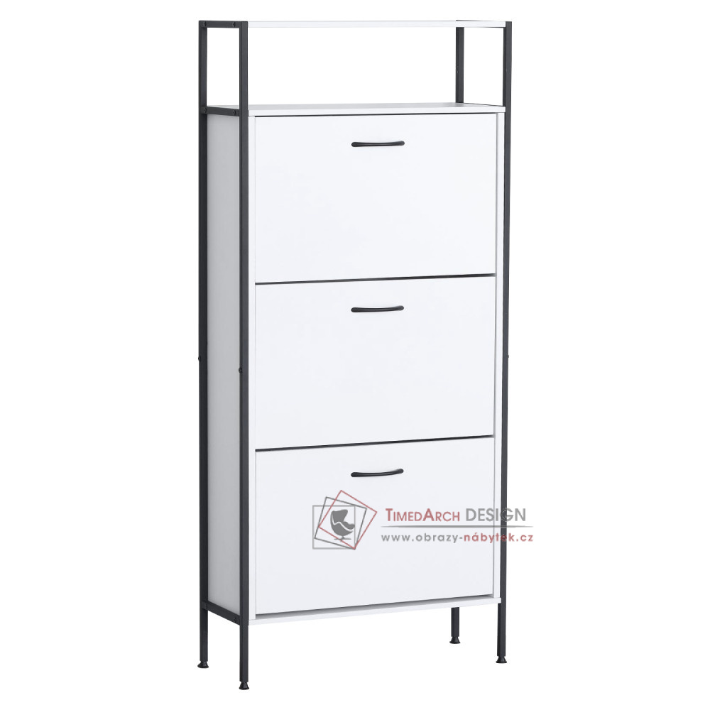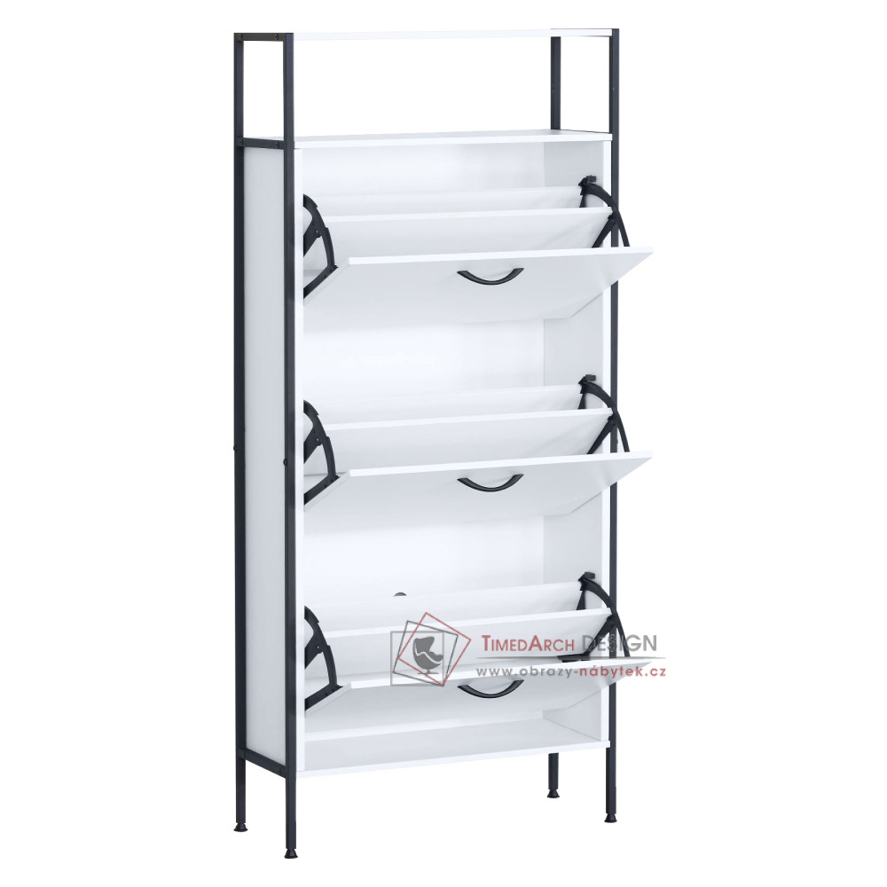 Má tři výklopné šuplíky, přičemž každý obsahuje dvě přihrádky, které poskytují dostatek místa pro boty od elegantních podpatků až po každodenní tenisky. Botník je vyroben z kombinace dřevotřísky a ocelové konstrukce a doplněn o plastové úchytky. Jeho minimalistický vzhled v bílé barvě s černými detaily se dokonale hodí do moderních interiérů. Výklopný mechanismus usnadňuje přístup k obuvi a pomáhá udržovat předsíň uklizenou.