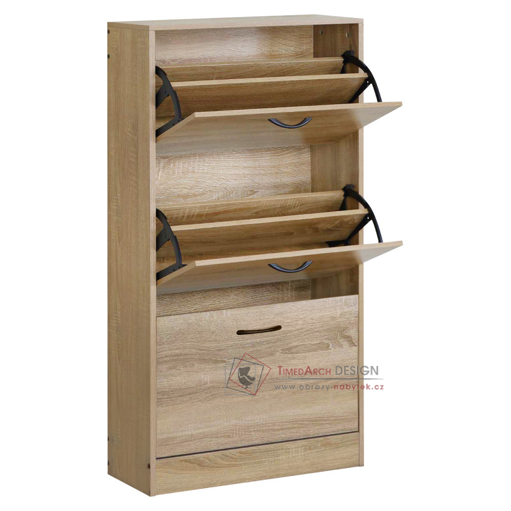 Díky třem výklopným úložným částem s více přihrádkami nabízí dostatek prostoru pro každodenní i výjimečné páry bot. Jeho minimalistický vzhled v barvě dub se dokonale hodí do moderních interiérů. Vyroben je z dřevotřísky a doplněn je o plastové úchytky. BOTORIA spolehlivě ukryje vaši obuv a zachová čistý vzhled místnosti.