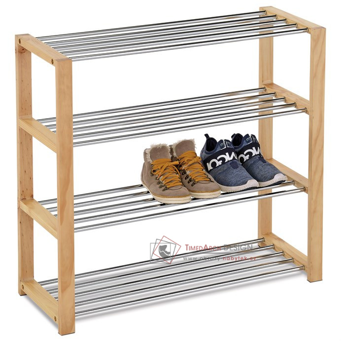 Díky svým rozměrům má výbornou ložnou plochu na uložení bot, ale prostorově se vejde i do menších předsíní. Kostra botníku je z masivního kaučukovníkového dřeva v přírodním odstínu, lakovaná transparentním lakem. Rošty jsou z kovových chromovaných trubek o průměru. 12 mm. Nosnost jednotlivých polic je 4 kg. S tímto botníkem budou rozházené boty po předsíni již jen minulostí.