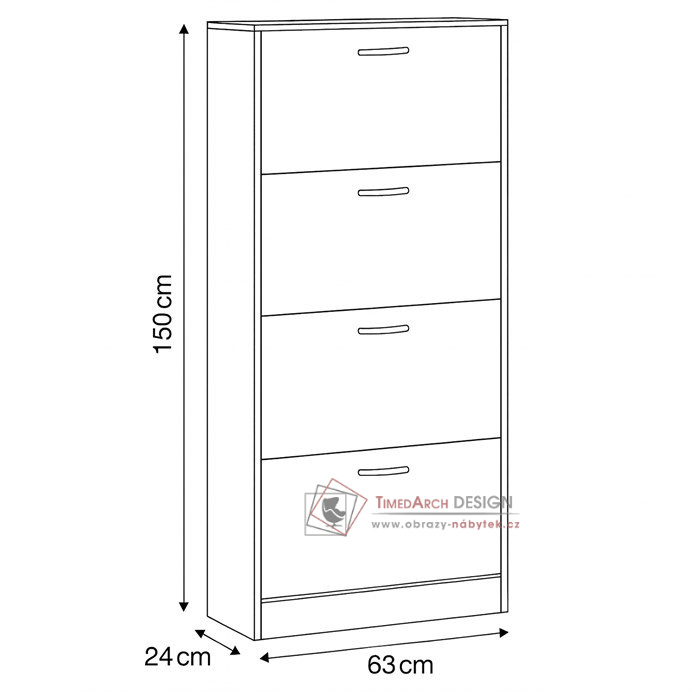 Každá přihrádka je opatřena černou kovovou úchytkou pro snadné otevírání a zavírání. Kompaktní a vysoký design umožňuje efektivní uspořádání obuvi i v menších prostorách, přičemž pevná konstrukce zajišťuje stabilitu a dlouhou životnost. Botník je vhodný do předsíní, chodeb nebo šaten, kde pomáhá udržet pořádek a přehlednost. Jeho rozměry a materiál se snadno udržují a odpovídají běžným požadavkům na domácí nábytek.