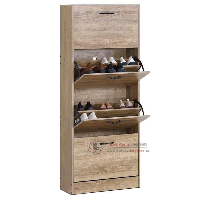 Botník s třemi přihrádkami v dekoru dub je vyroben z MDF desek s povrchovou úpravou, která napodobuje přirozenou strukturu dřeva.