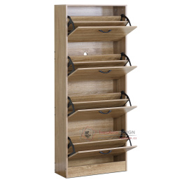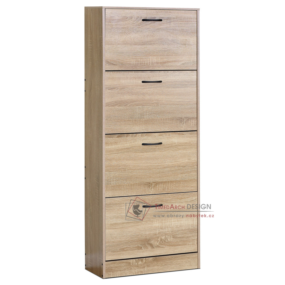 Botník s čtyřmi přihrádkami v dekoru dub je vyroben z MDF desek s povrchovou úpravou, která napodobuje přírodní strukturu dřeva.