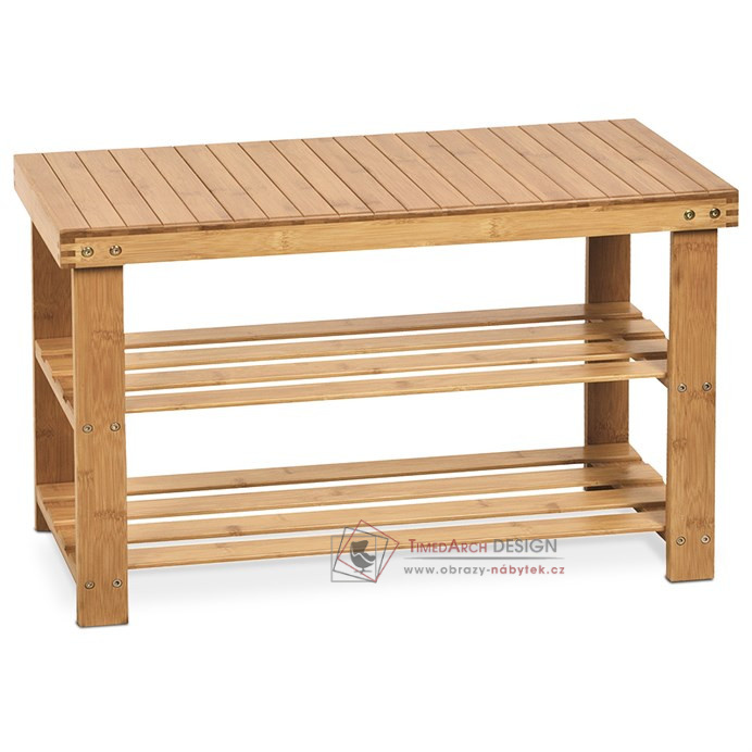 Bambusový botník má dvě odkládací police a plochu k sezení. Výhodou lavice je její praktické využití také např. v koupelně.