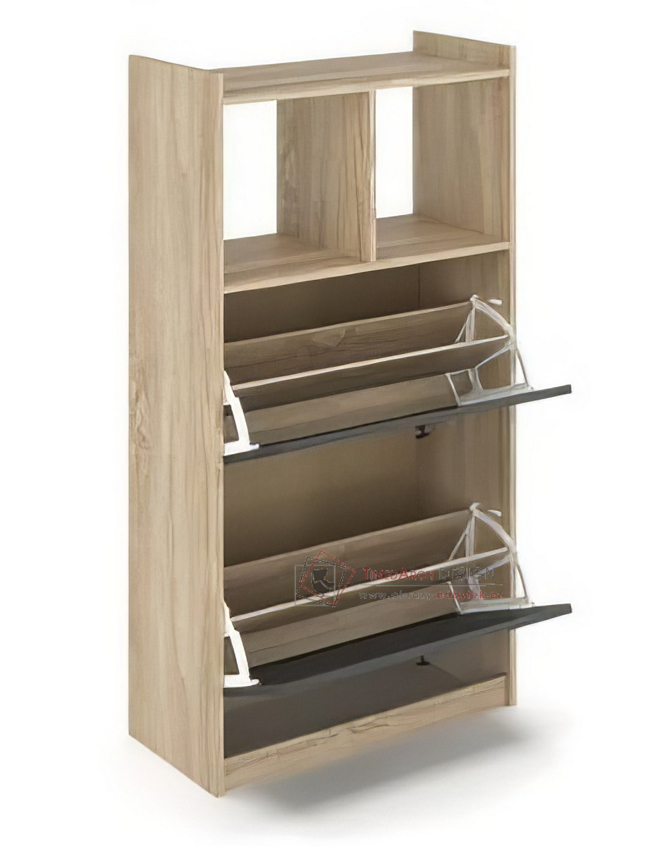 Botník se dvěmi výklopnými dvířky PIZZO je vyrobený z laminované DTD v barveném provedení dub sonoma.