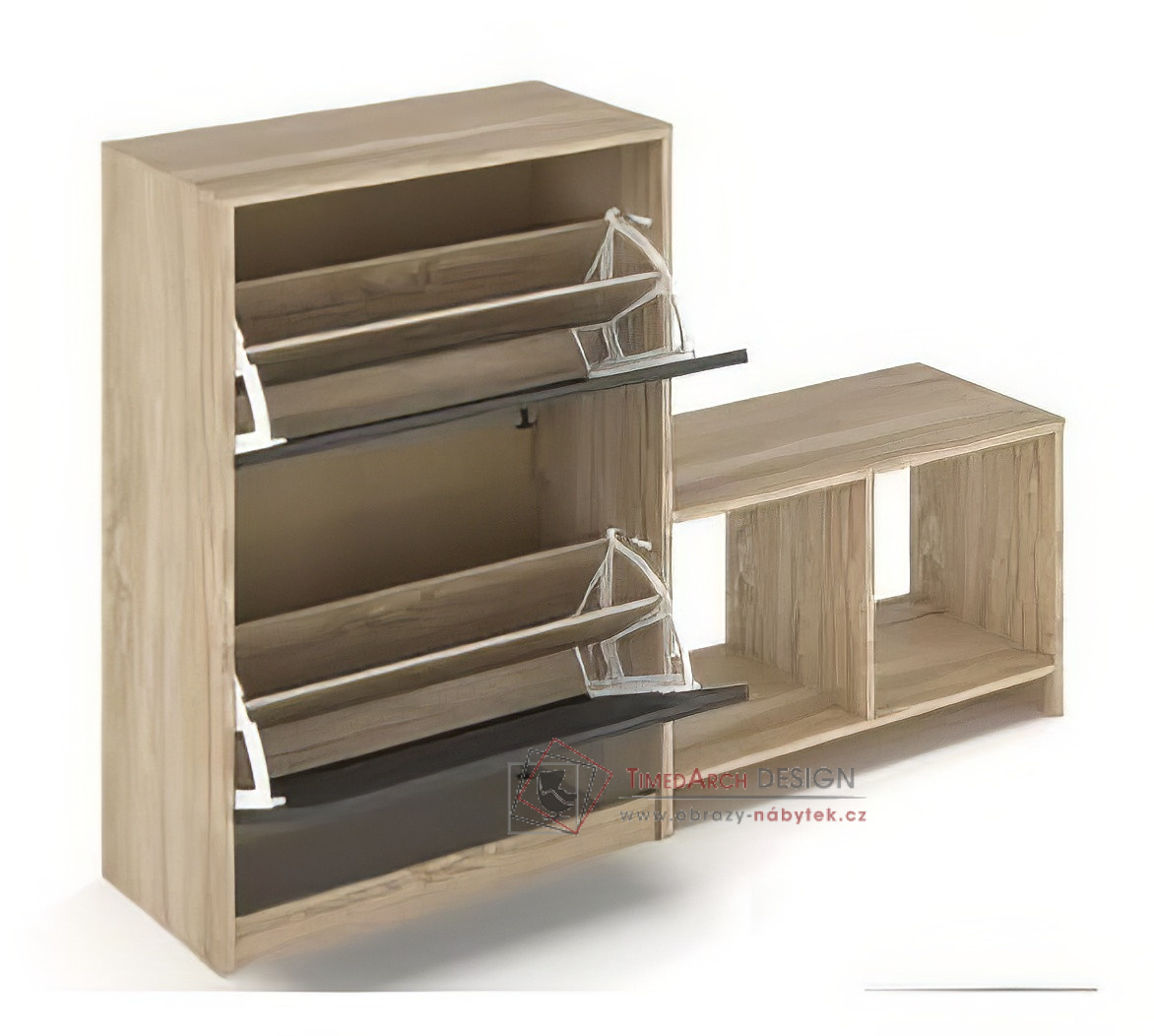 Botník se dvěmi výklopnými dvířky PIZZO je vyrobený z laminované DTD v barveném provedení dub sonoma.
