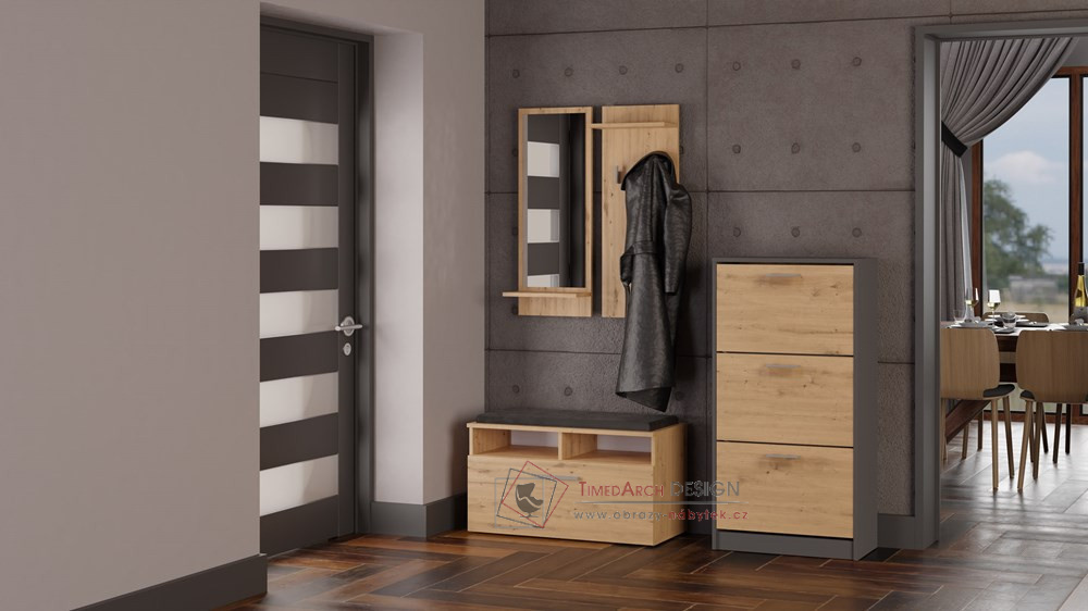 Pečlivé zpracování a minimalistický design dodají vaší předsíni styl i funkční úložný prostor. Nábytek je vyroben z vysoce kvalitního lamina, které je snadno udržovatelné a odolné proti oděru, dlouhou životnost nábytku zajišťují hrany zakončené ABS materiálem.