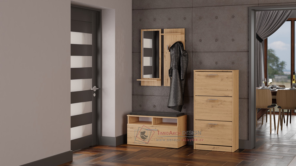 Pečlivé zpracování a minimalistický design dodají vaší předsíni styl i funkční úložný prostor. Nábytek je vyroben z vysoce kvalitního lamina, které je snadno udržovatelné a odolné proti oděru, dlouhou životnost nábytku zajišťují hrany zakončené ABS materiálem.