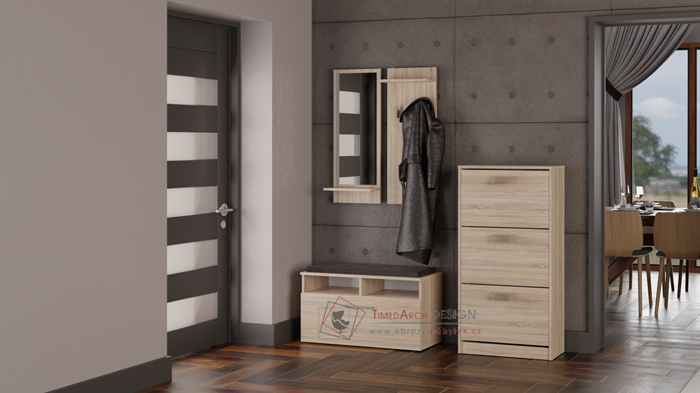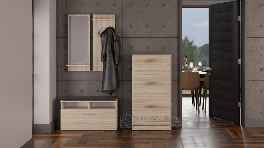Pečlivé zpracování a minimalistický design dodají vaší předsíni styl i funkční úložný prostor. Nábytek je vyroben z vysoce kvalitního lamina, které je snadno udržovatelné a odolné proti oděru, dlouhou životnost nábytku zajišťují hrany zakončené ABS materiálem.