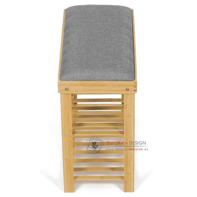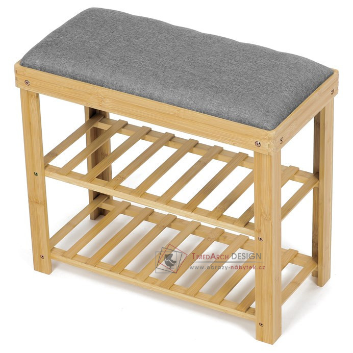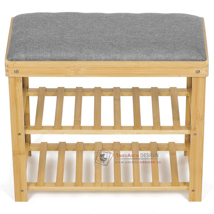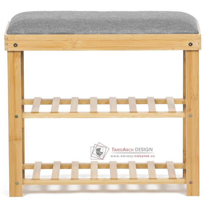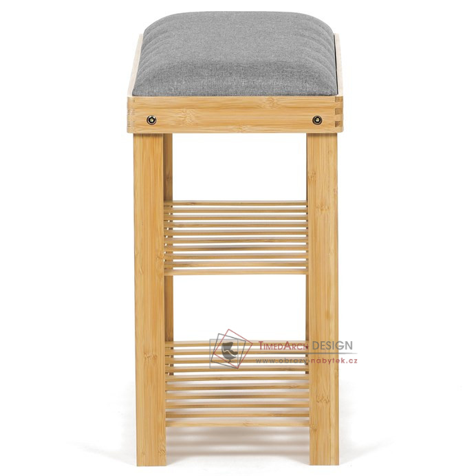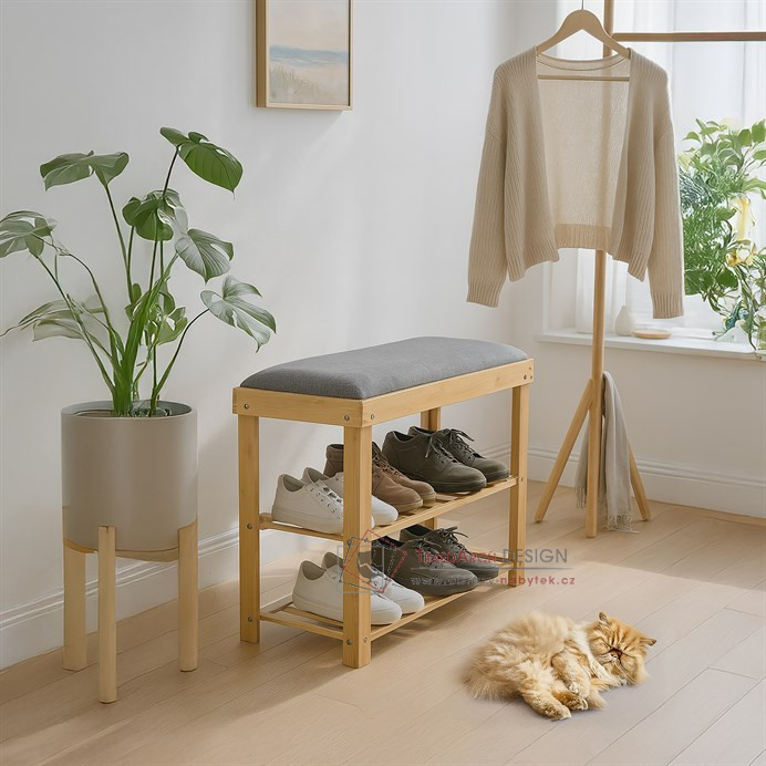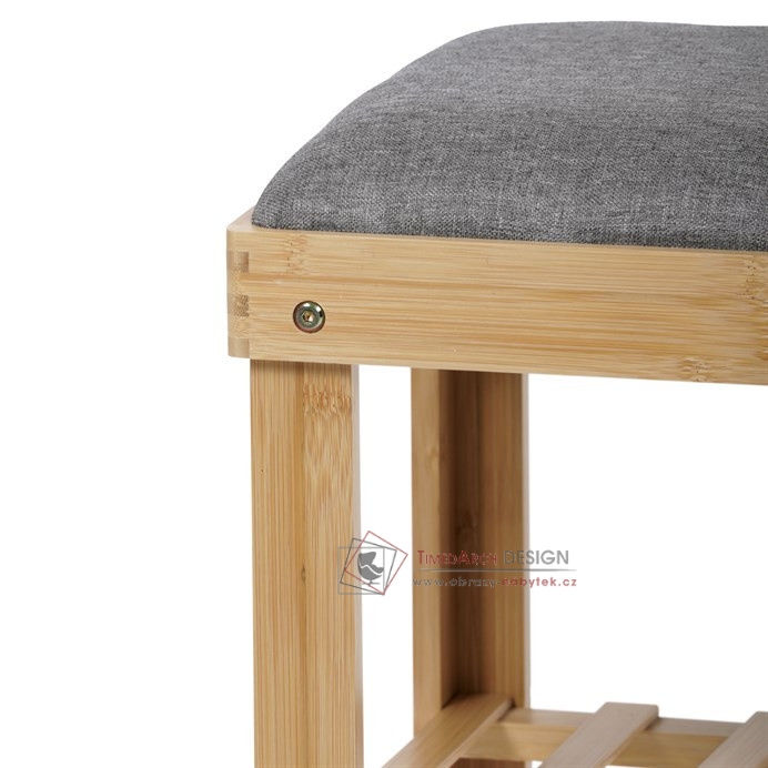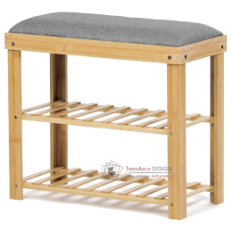 Vyroben z masivního bambusu v přírodní barvě, nabízí dvě prostorné police pro vaši obuv. Horní polstrovaná sedací plocha v šedé barvě poskytuje komfort při obouvání. Robustní konstrukce zajišťuje dlouhou životnost a stabilitu. Botník je ideální pro umístění do předsíně, kde vám pomůže udržet pořádek a zároveň dodá vašemu domovu moderní a útulný vzhled.