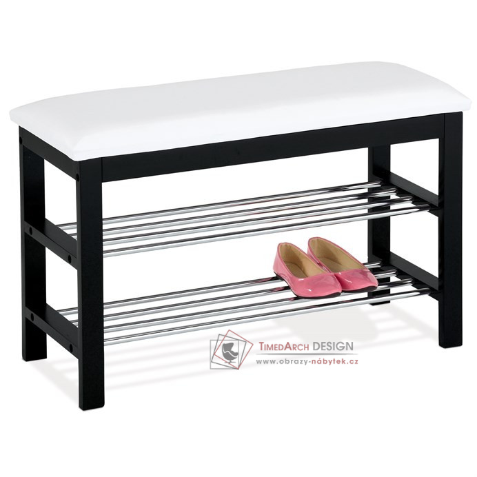 Díky svým rozměrům má ideální ložnou plochu na uložení bot, ale prostorově se vejde i do menších předsíní. Měkký sedák je potažen bílou hladkou ekokůží, výplň je z PU pěny. Kostra botníku je z masivního kaučukovníkového dřeva v černém matném laku. Rošty jsou z kovových chromovaných trubek o průměru 12 mm. Nosnost na sezení je 90 kg, nosnost jednotlivých polic je 6 kg. Dodáváno v demontu.