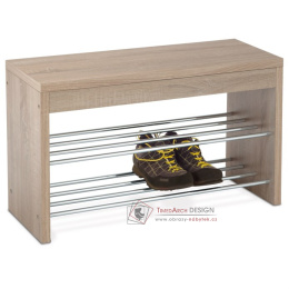 Díky svým rozměrům má ideální ložnou plochu na uložení bot, ale prostorově se vejde i do menších předsíní. Kostra botníku je z MDF v 3D dekoru dub sonoma. Rošty jsou z kovových chromovaných trubek o průměru 12 mm. Nosnost na sezení je 90 kg, nosnost jednotlivých polic je 6 kg. Dodáváno v demontu.