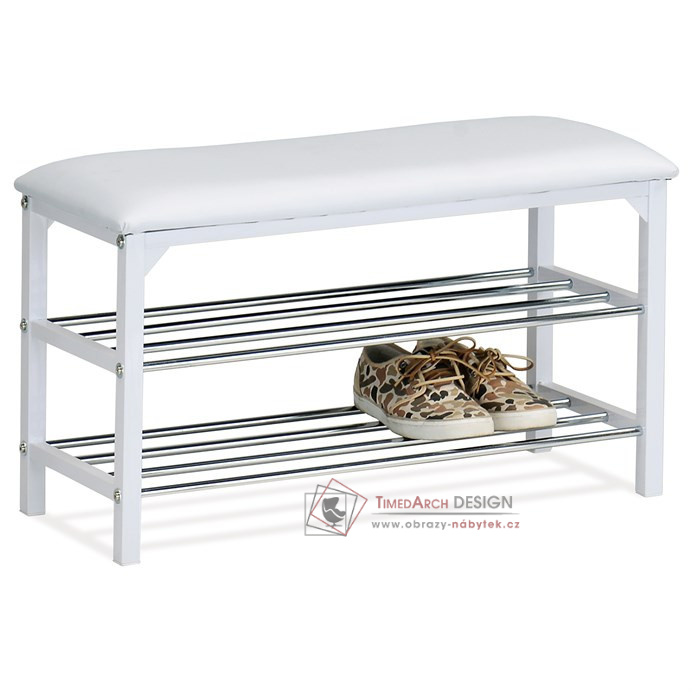 Díky svým rozměrům má ideální ložnou plochu na uložení bot, ale prostorově se vejde i do menších předsíní. Měkký sedák je potažen bílou hladkou ekokůží, výplň je z PU pěny. Kostra botníku je ze svařovaných profilů v povrchové úpravě bílou matnou práškovou barvou. Rošty jsou z kovových chromovaných trubek o průměru 12 mm. Nosnost na sezení je 90 kg, nosnost jednotlivých polic je 8 kg. Dodáváno v demontu.