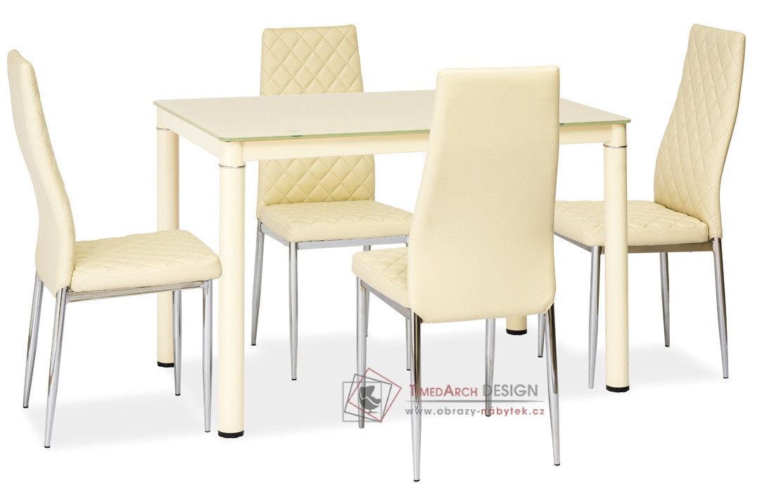 Jídelní stůl GALANT na kovové podnoži v krémové barvě, stolní deska je z tvrzeného skla taktéž v krémové barvě.