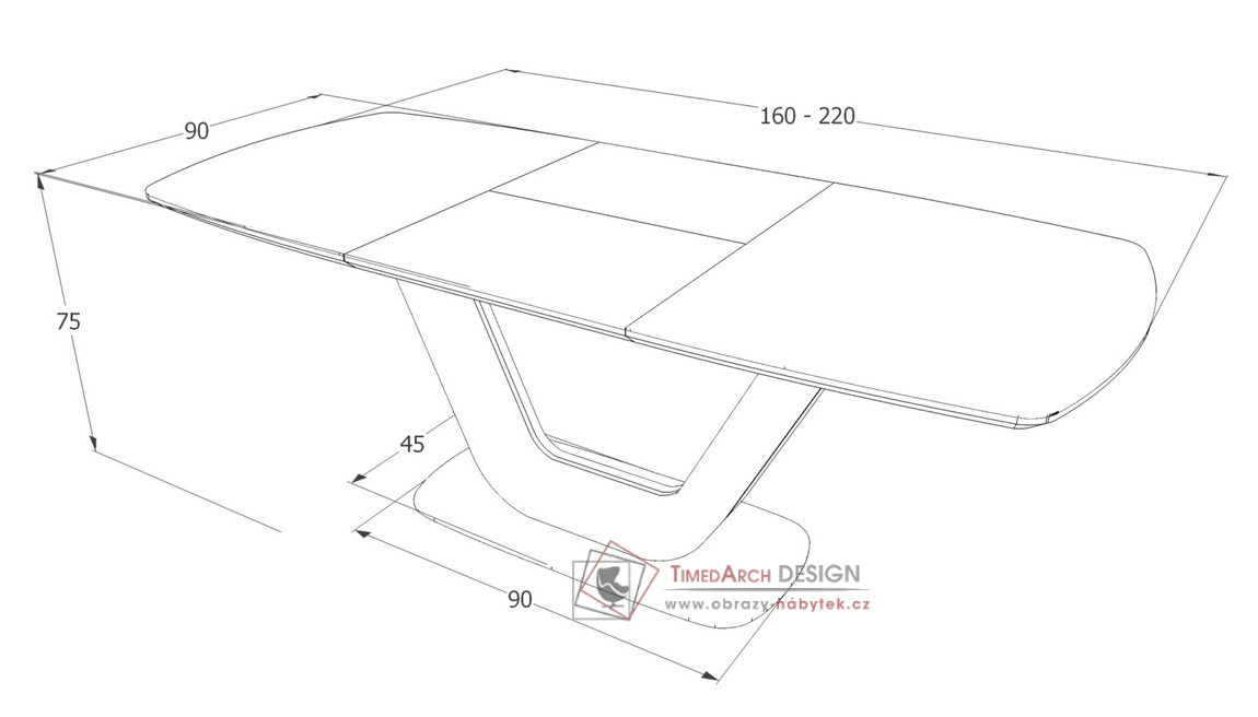 Plocha stolu před rozložením je 90x160 cm, po rozložení 90x220 cm. Stůl je určen až pro 8 osob.