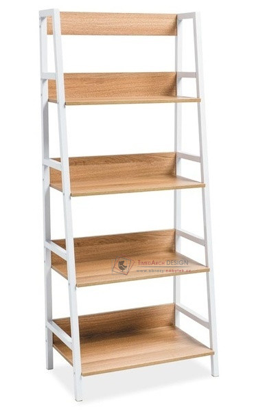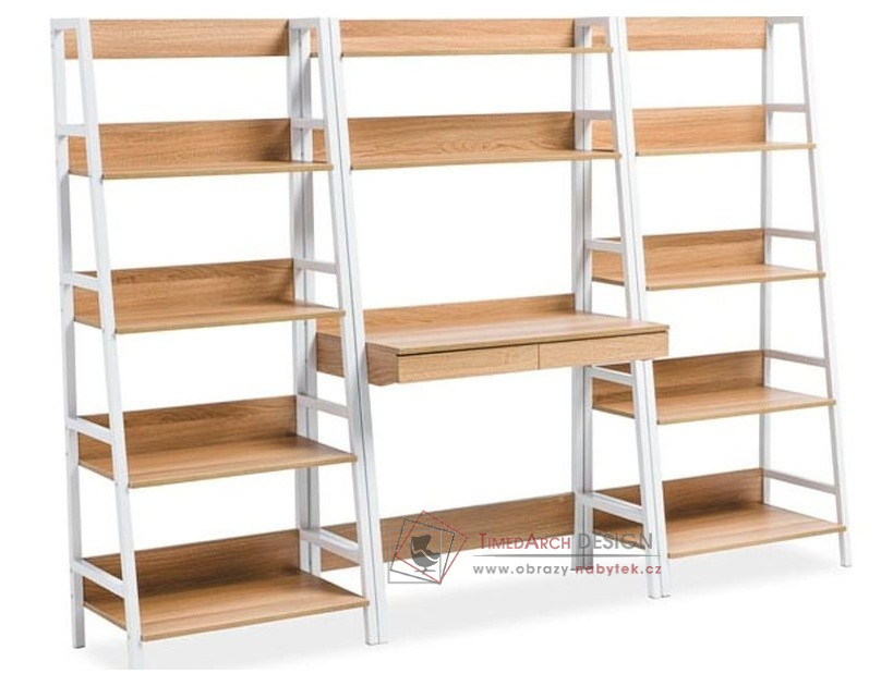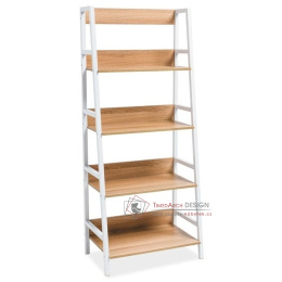 Konstrukce regálu je kovová, bílé barvy. Police jsou jsou vyrobené z dýhované MDF v barvě dub. Vhodný i pro menší pokoje. Možno kombinovat s pracovním stolek OLSEN B ve shodném provedení.