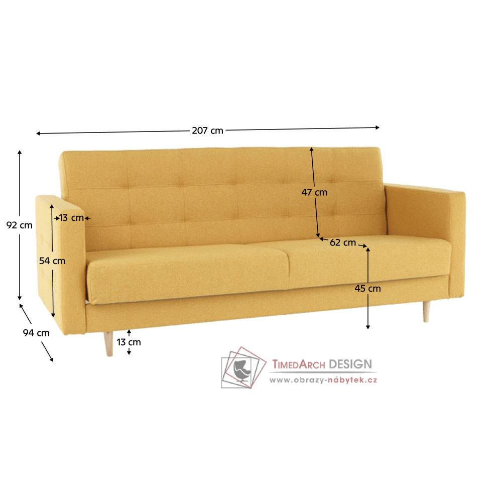 Celočalouněný rozkládací 3-sed AMEDIA se stane dominantou vašeho pokoje. 3-sed s křesly je vyroben z látky NORN v hořčicové barvě. Dekorativní prošití opěradla a vnějších stran područek dodává sestavě šmrnc. V případě nečekané návštěvy vám sedačka nabízí plochu na spaní v rozměru 124x180 cm . Součástí sedačky je i praktický úložný prostor. Dopřejte si i vy tento jedinečný kousek a ohromte tím nejednu vaši návštěvu.