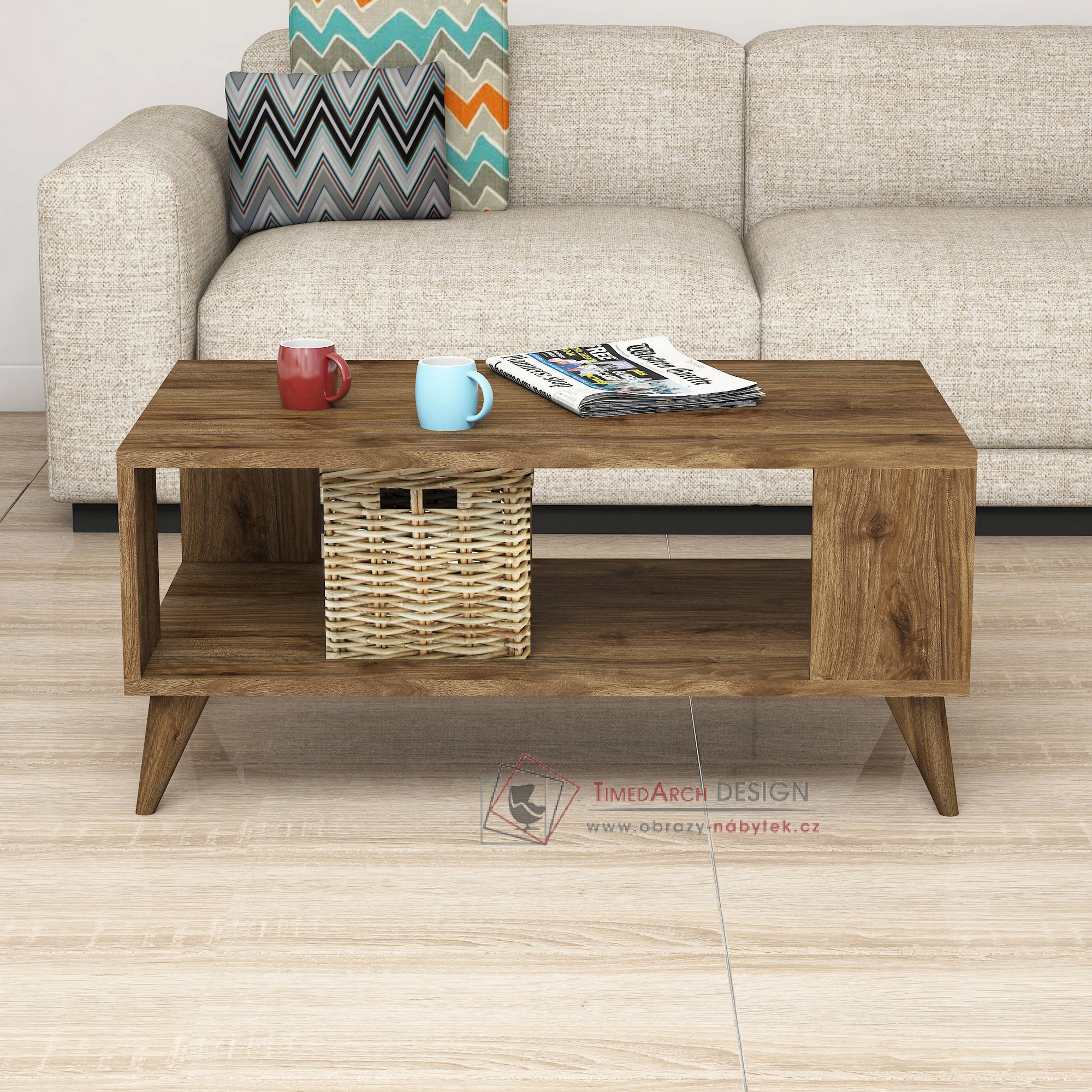 Díky své jednobarevné barvě a bohémskému konceptu je tento konferenční stolek výrazným kouskem, který okamžitě pozvedne vzhled a atmosféru vašeho obývacího pokoje. Jeho ořechová barva dodává nádech sofistikovanosti a elegance, díky čemuž je perfektním doplňkem jakéhokoli moderního i tradičního interiéru.