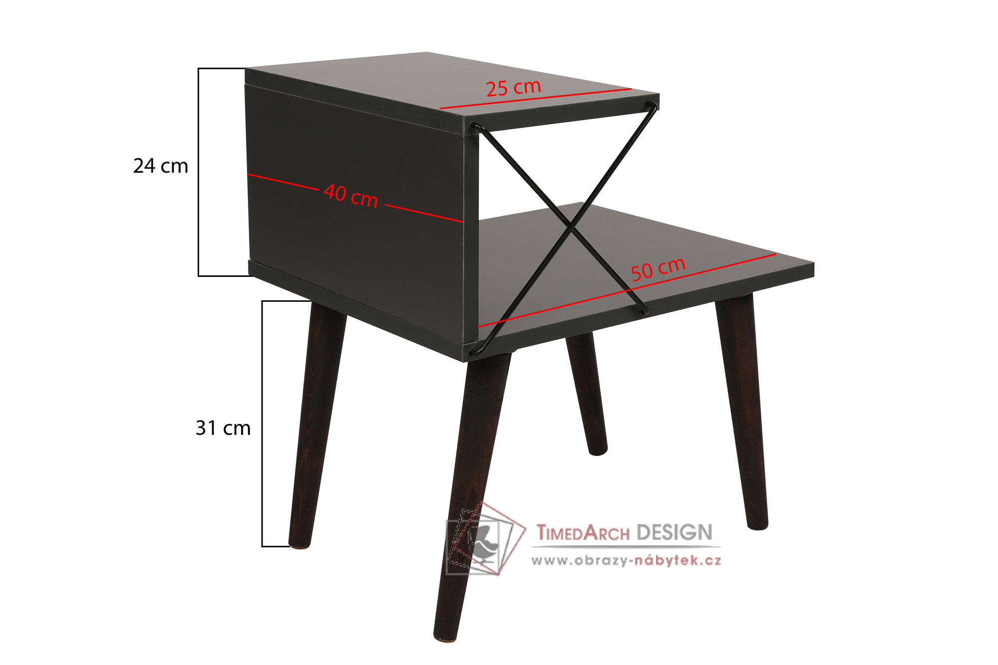 S mnoha policemi nabízí tento noční stolek dostatek úložného prostoru pro uložení vašich nezbytností uspořádaných a na dosah ruky. Spodní police o délce 50 cm poskytuje dostatek prostoru pro větší předměty, zatímco horní police o délce 25 cm je ideální pro menší předměty nebo dekorativní kousky.