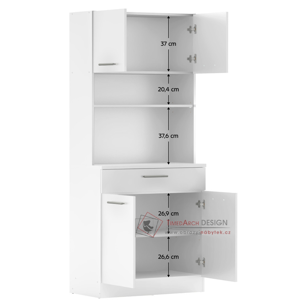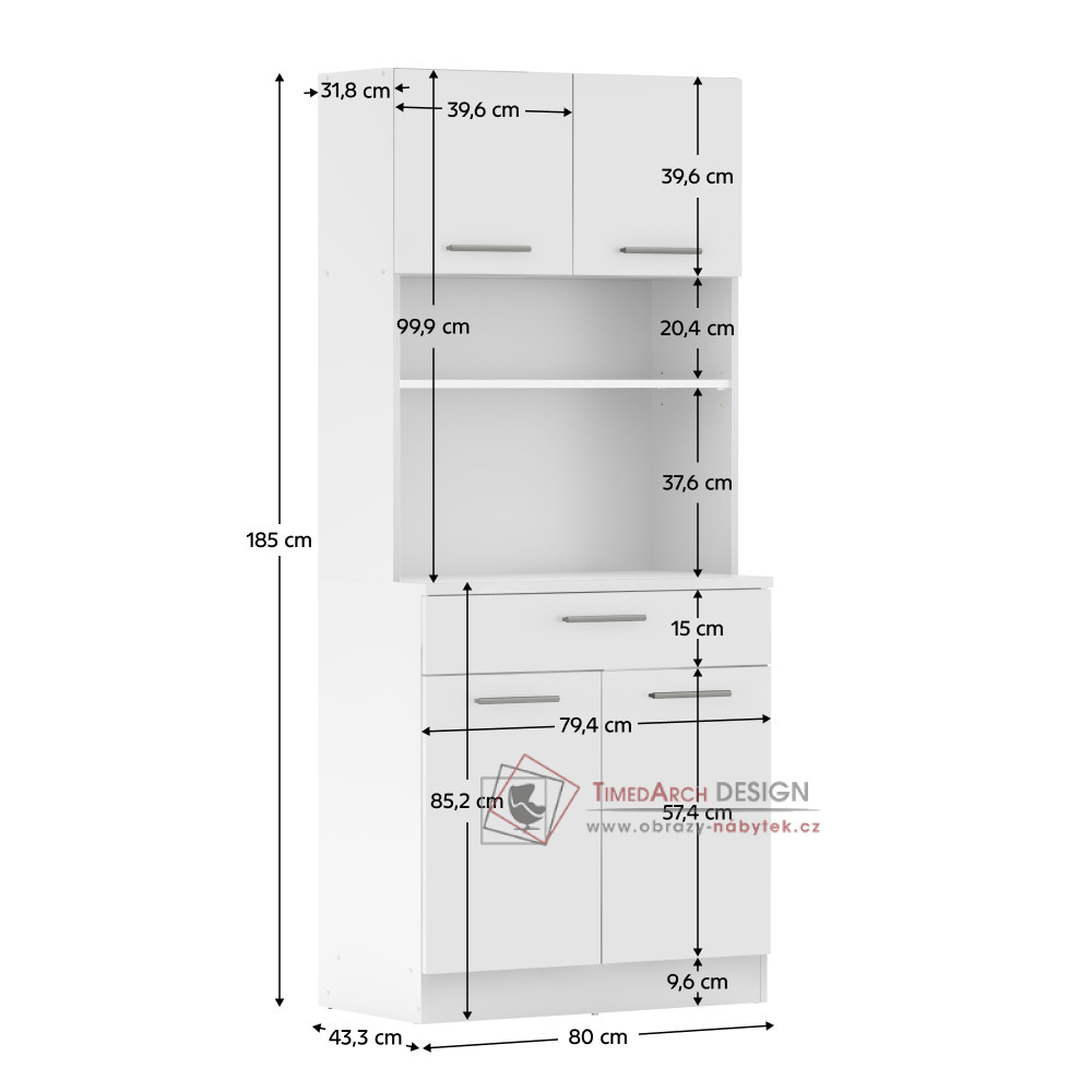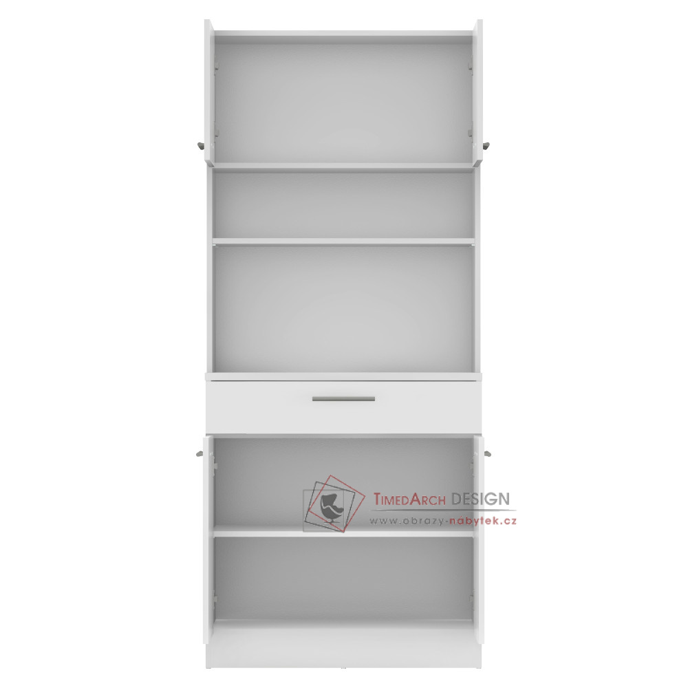 Materiál: laminovaná DTD Barva: bílá Rozměry (ŠxHxV): 80x43,3x185 cm Tloušťka materiálu: 1,6 cm Tloušťka vrchního plátu spodní skříňky: 2,2 cm Čtyřdveřový Policový Nosnost police: 5 kg 1 zásuvka Rozměry zásuvky (ŠxV): 79,4x15 cm Nosnost zásuvky: 5 kg S úchytkami Materiál úchytek: PVC Barva úchytek: stříbrná Na kluzácích Praktický Víceúčelový Kvalitní slovenský výrobek Doporučujeme připevnit ke zdi Dodáváno v demontu