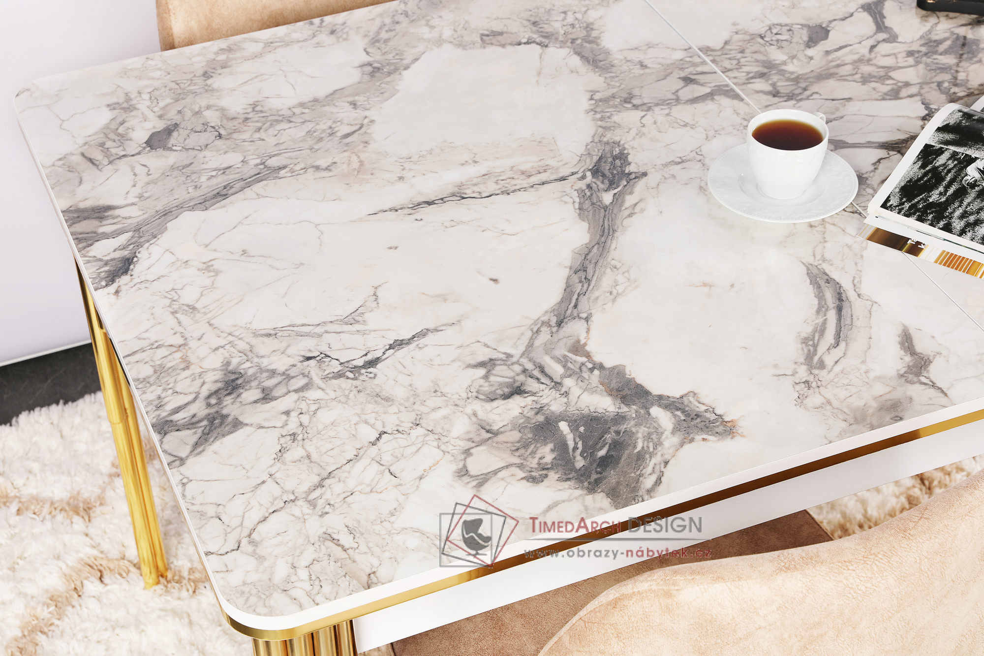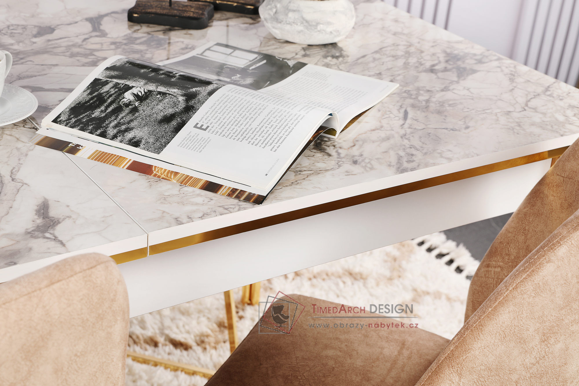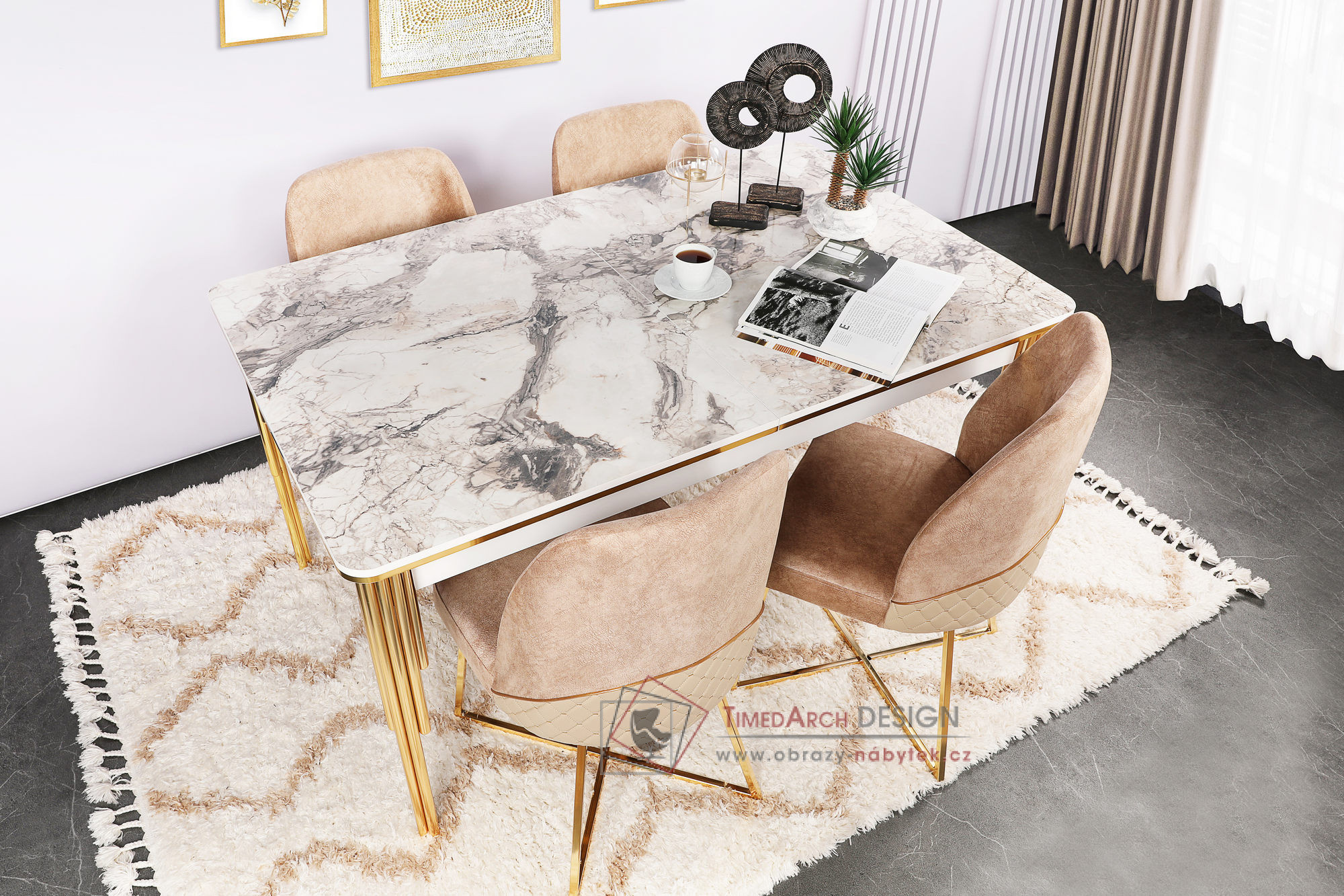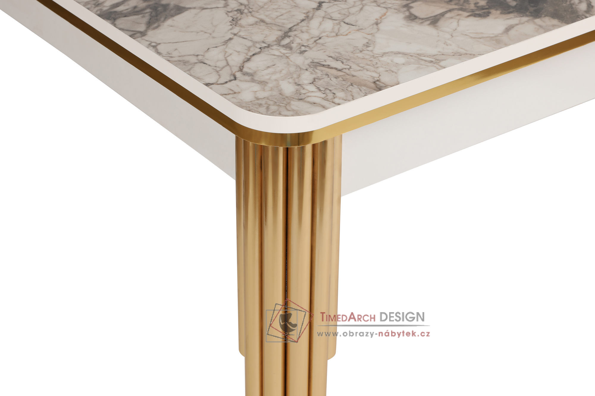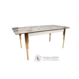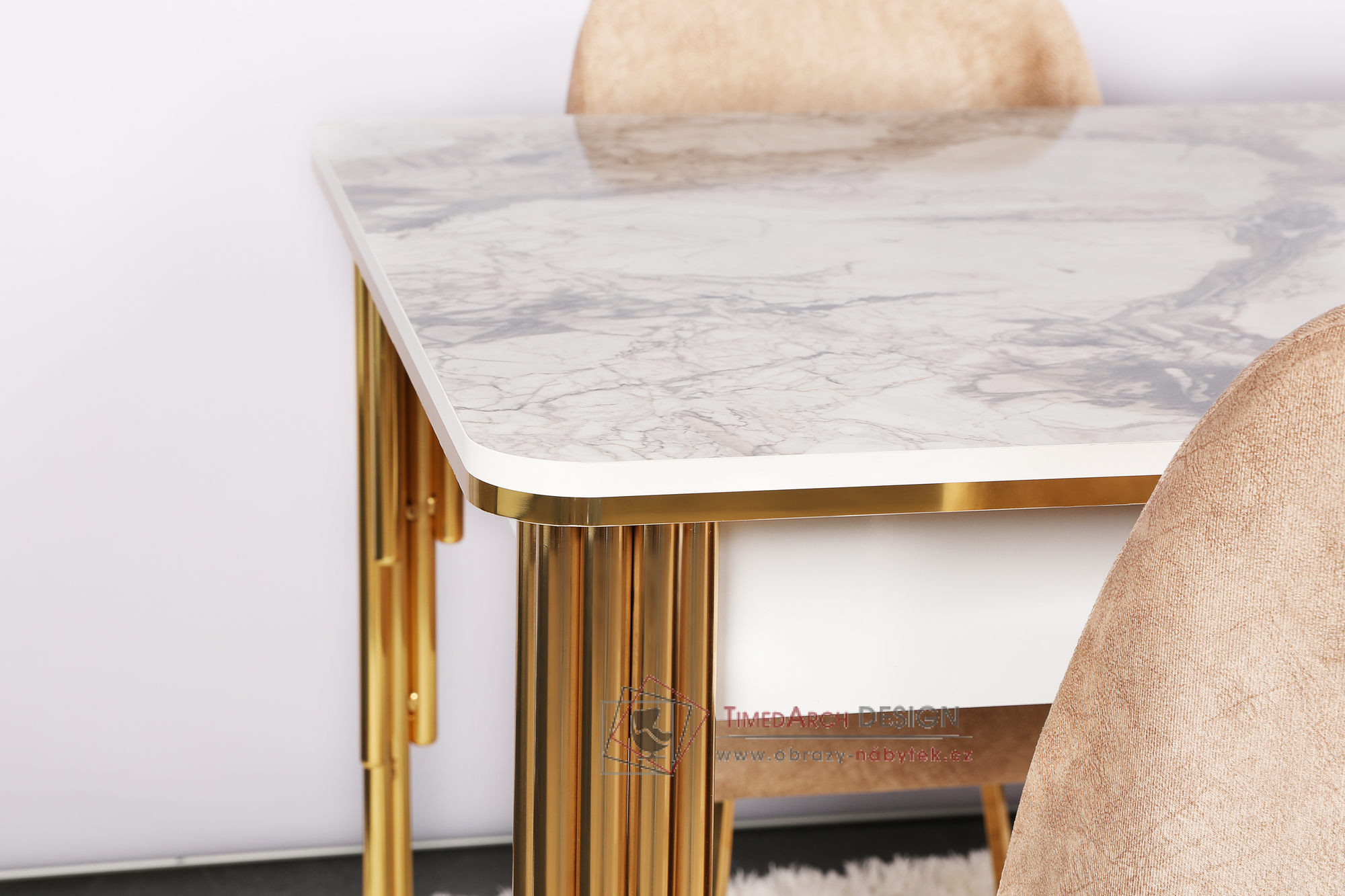 Kombinace zlaté a bílé barvy v tomto jídelním stole vytváří podmanivý vizuální dojem, který bez námahy doplní jakýkoli interiér. Jednobarevný antracitový a barokní koncept dodá vašemu jídelnímu prostoru nádech sofistikovanosti a elegance a stane se ústředním bodem vašeho domova.