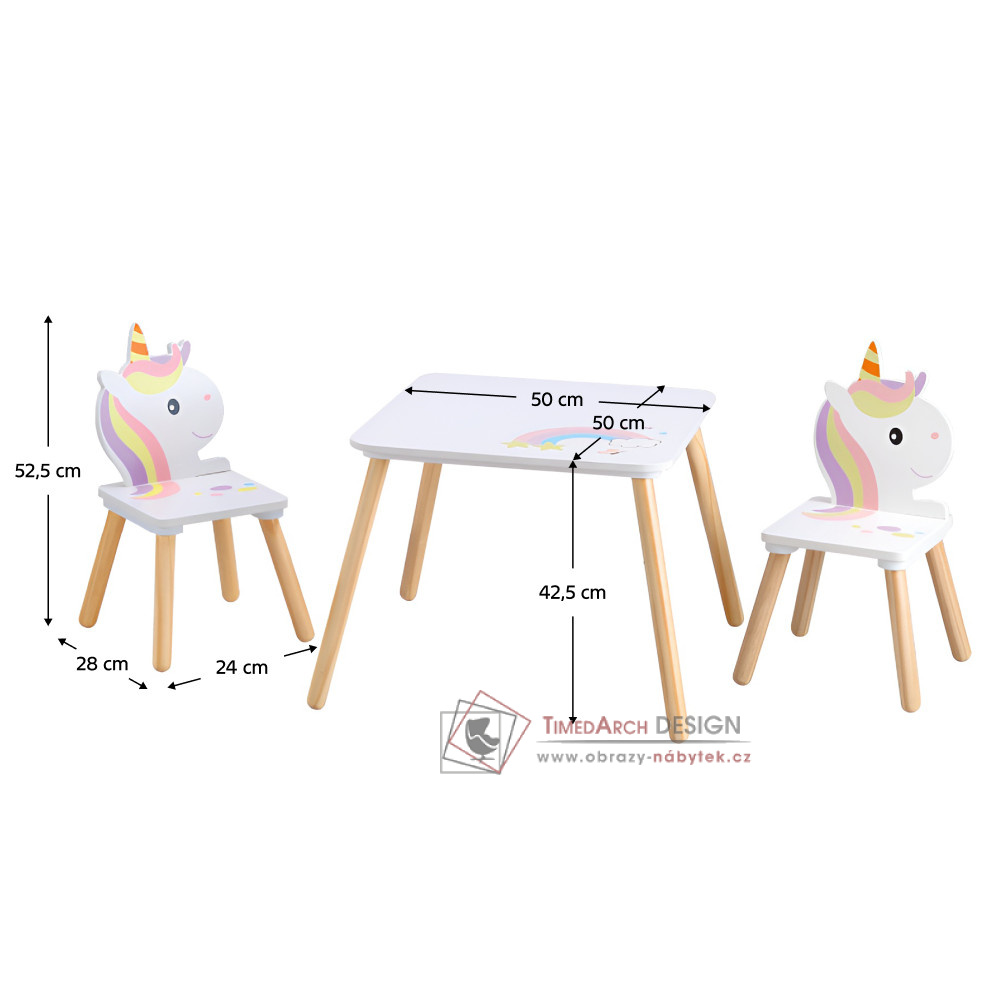 Stolek s židlemi v bílé a přírodní barvě zdobí veselé ilustrace jednorožců, které okamžitě přemění každý dětský pokoj na kouzelné království plné fantazie. Set je vyroben z masivního borového dřeva a MDF, což zaručuje dlouhou životnost a bezpečné používání. Všechny hrany jsou pečlivě zaobleny, aby se minimalizovalo riziko poranění. Tento praktický set je ideální pro kreslení, skládání puzzle, čajová posezení s kamarády či jakékoli tvořivé dobrodružství. Skvěle poslouží také v herně, školce nebo na rodinných oslavách, kde si děti mohou vytvořit vlastní kouzelný koutek. Díky ideální výšce se děti budou cítit pohodlně jako na svém trůnu. A jednorožci? Budou při každé hře jejich věrnými, tichými společníky.