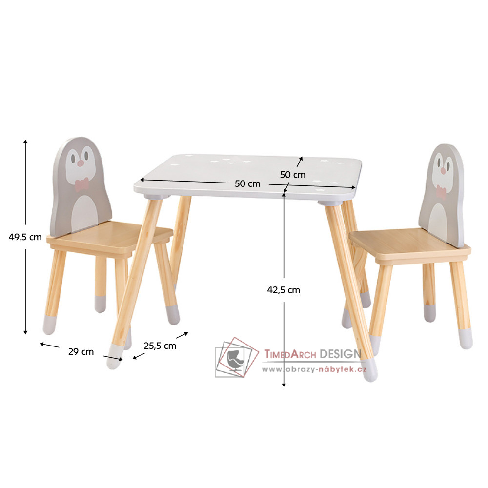 Stolek s židlemi v bílé a šedé barvě zdobí veselé ilustrace tučňáků, které okamžitě přemění každý dětský pokoj na kouzelné království plné fantazie. Set je vyroben z masivního borového dřeva a MDF, což zaručuje dlouhou životnost a bezpečné používání. Všechny hrany jsou pečlivě zaobleny, aby se minimalizovalo riziko poranění. Tento praktický set je ideální pro kreslení, skládání puzzle, čajová posezení s kamarády či jakékoli tvořivé dobrodružství. Skvěle poslouží také v herně, školce nebo na rodinných oslavách, kde si děti mohou vytvořit vlastní kouzelný koutek. Díky ideální výšce se děti budou cítit pohodlně jako na svém trůnu. A tučňáci? Budou při každé hře jejich věrnými, tichými společníky.