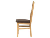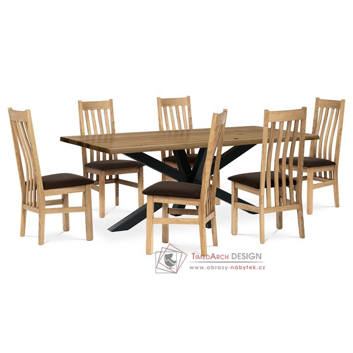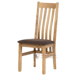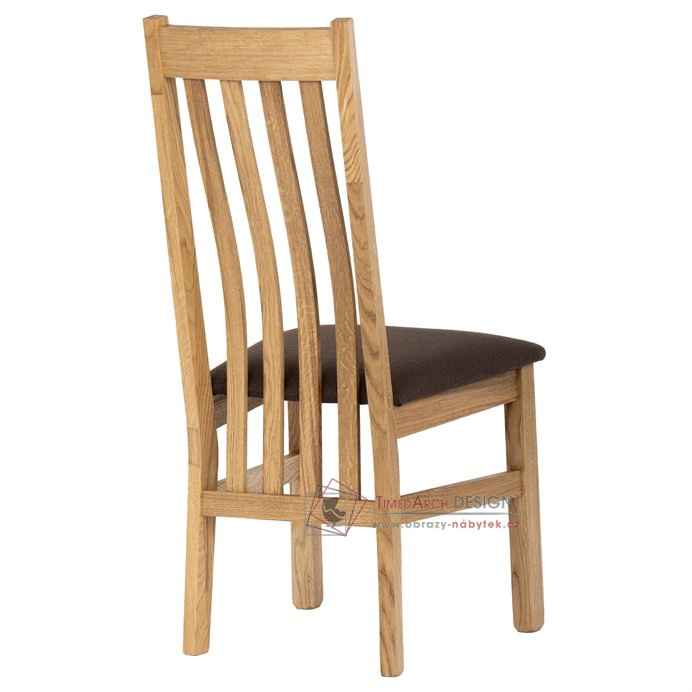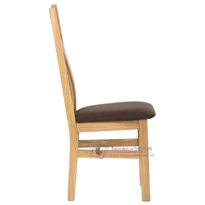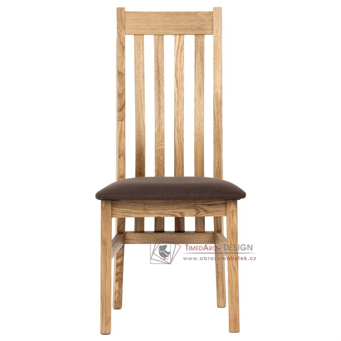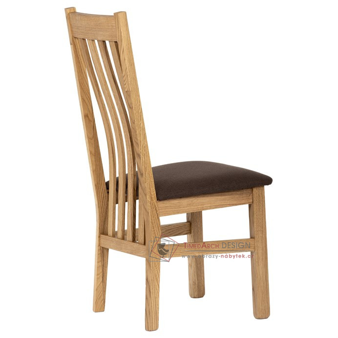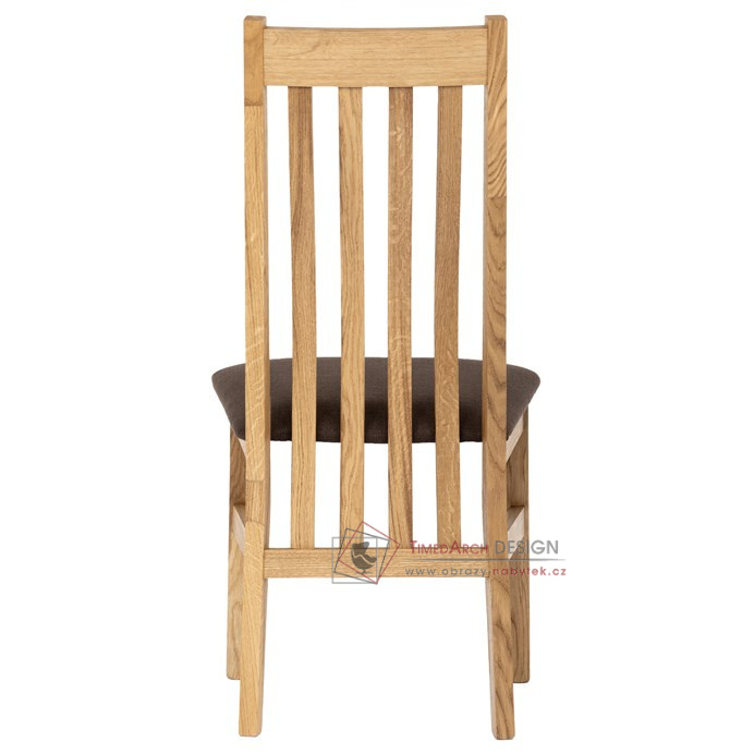 Zaujme nejen svým rustikálním stylem, ale i perfektním zpracováním. Styl vychází z minimalistického severského designu, v temnějším nádechu přírodního odstínu. Tato barevnost skvěle vykreslí léta dubu a podtrhne její provedení. Čisté linie a vysoce kvalitní řemeslné zpracování dřevěného masivu nastavuje okouzlující akcenty a podtrhuje útulnou atmosféru v interiéru. Tato židle Vás zve nejen k odpočinku, ale rozjímání s rodinou i přáteli, kde oceníte ergonomicky tvarované vzpěry opěradla, kopírující zakřivení páteře. Pohodlný sedák je potažen odolnou látkou z polyesterových vláken, v čokoládově hnědém barevném odstínu. Polstrování je kvalitní PU pěnou. O kvalitě potahové látky Vás jistě přesvědčí její parametry - gramáž 340 g/m2, martindale naprosto skvělých 80 000 cyklů a barevná stálost na světle je na stupni 5. Povrchová úprava dubové masivní konstrukce je tvrdovoskovým olejem, speciálně určeným pro dlouhodobé ošetření dřeva. Velkým bonusem této židle je její dodání v kompletně smontovaném stavu a se spoji lepenými (!). Tím odpadá nejen nepříjemné studium montážního návodu a následně i montáž, ale židle bude stále pevná a nehrozí, že budete muset v pravidelných cyklech utahovat povolené šrouby. Další pevnostní prvek slouží i trnože mezi nohama. Toto vše dělá ze židle pevný a velice trvanlivý celek s nosností až 140 kg. Elegantním prvkem bude v klasicky laděných interiérech společně s masivním dubovým stolem, ale i kombinace se stolem ve stylu Loft bude velmi zajímavá a nepřehlédnutelná.