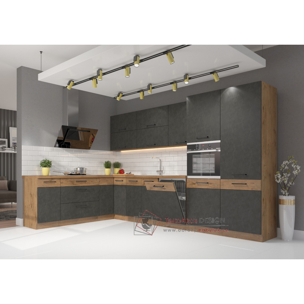 Vařit a péct v kuchyni, která je navíc zařízená moderním a multifunkčním nábytkem, je doslova radost. Vybavte svou kuchyni linkou VEGA, vaření se stane pro vás návykům. Moderní vzhled zaručuje barevná kombinace šedá matná a dub lancelot. Vyrobena je z DTD laminované. Dvířka se pyšní systémem tichého zavírání a šuplíky zase systémem tichého dorazu. Vybírat můžete z množství typů skříněk, což umožňuje poskládat si kuchyňskou linku podle vlastních možností a požadavků. Spodní skříňky jsou dodávány včetně dolní lišty. Pracovní deska není součástí skříněk. Je možné si doobjednat pracovní desku v provedení dub lancelot.