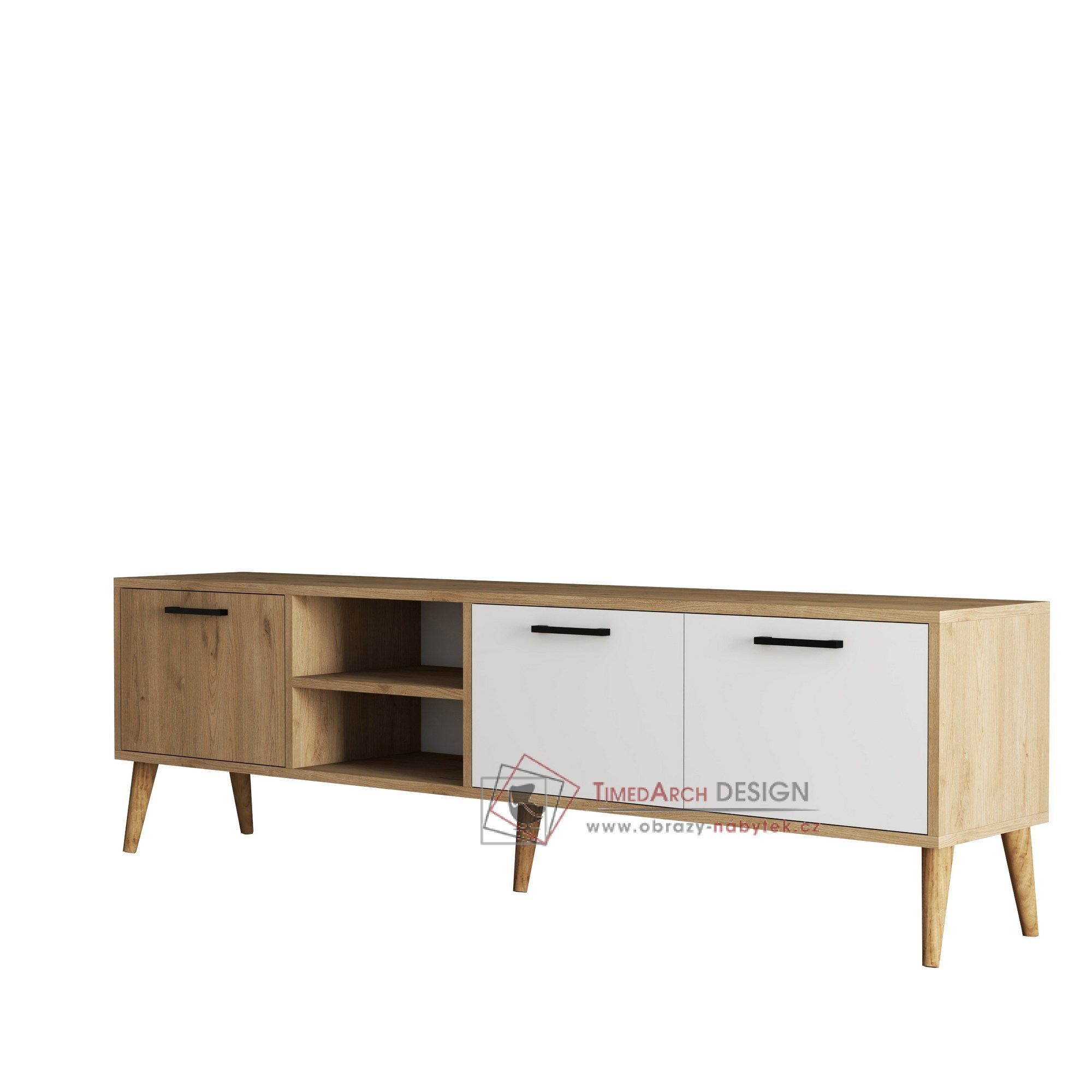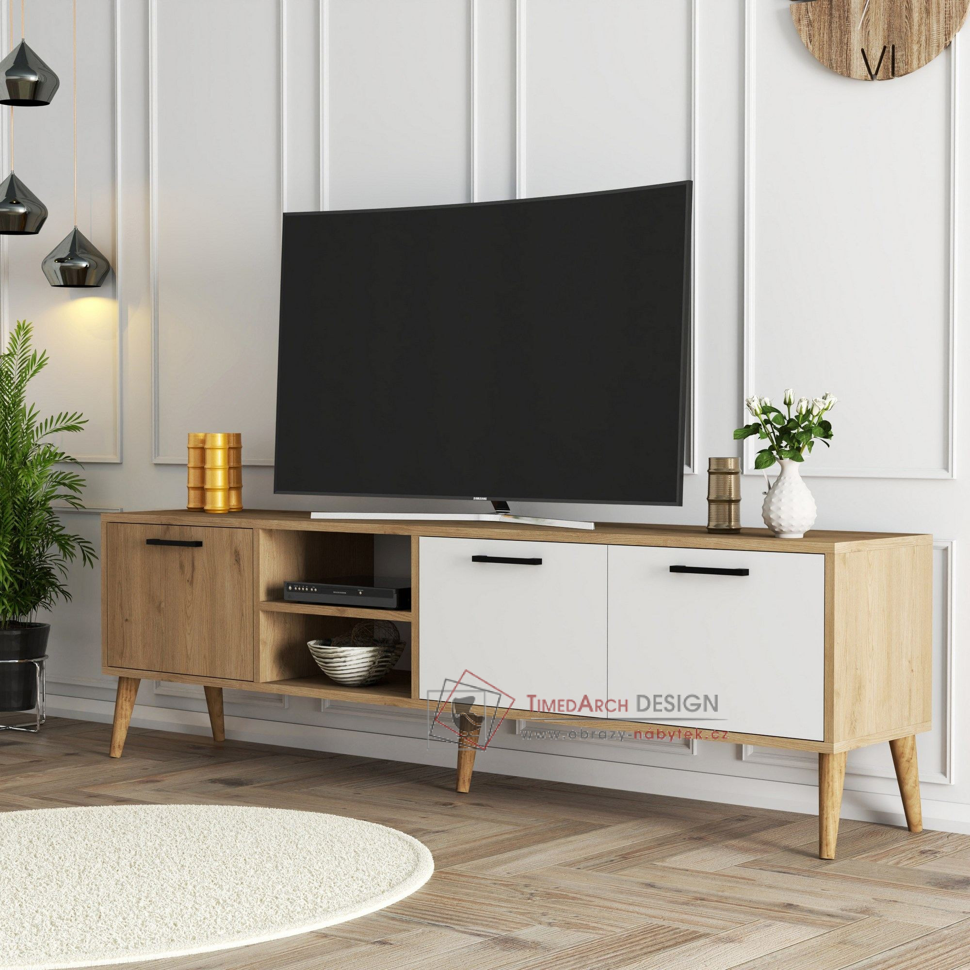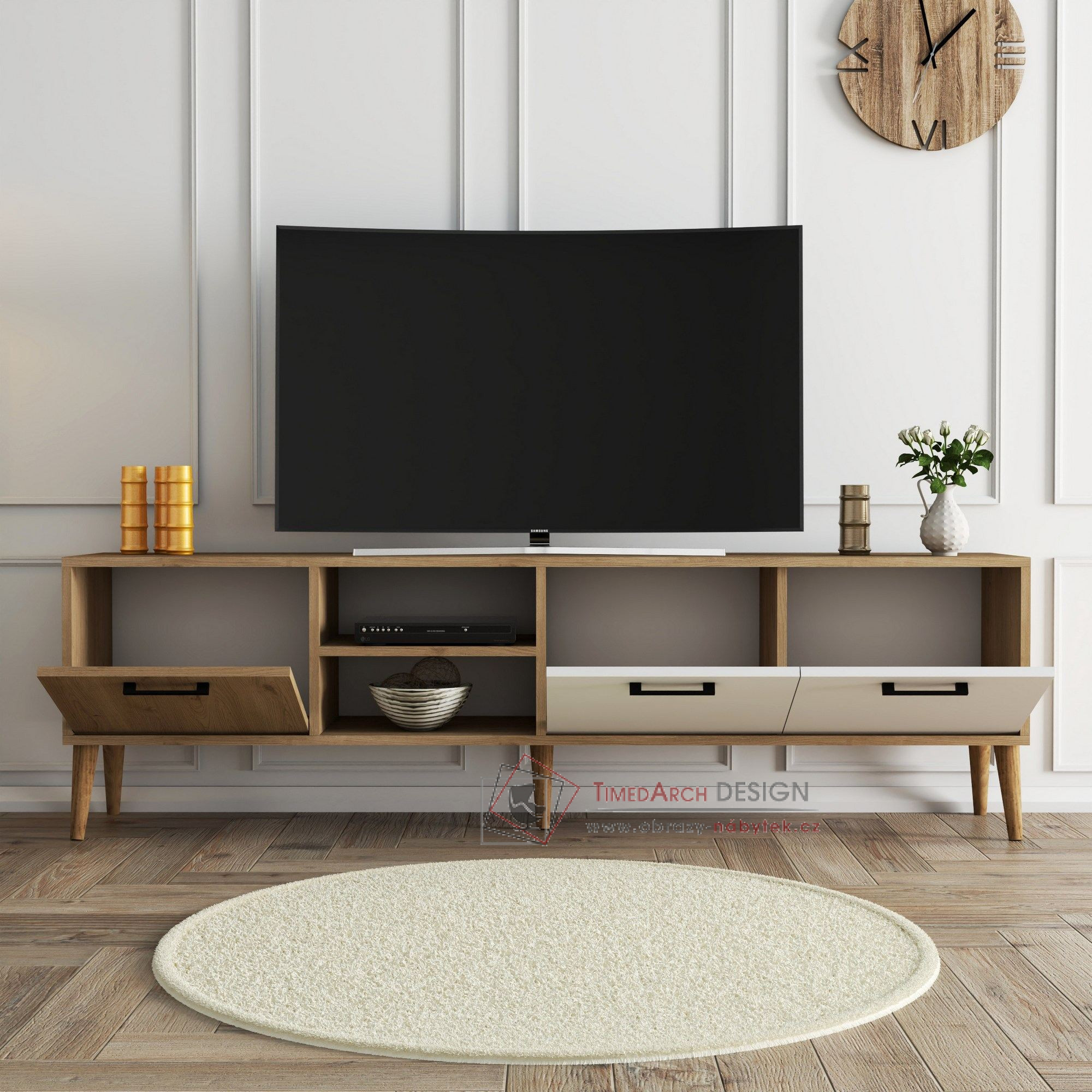 Díky elegantnímu designu a jednolité barevné koncepci vyzařuje náš TV stolek sofistikovanost a modernitu a vytváří podmanivý ústřední bod v každé místnosti. Kombinace dubové a bílé barvy dodává nádech tepla a všestrannosti, díky čemuž se bez problémů hodí do jakéhokoli stávajícího interiéru.