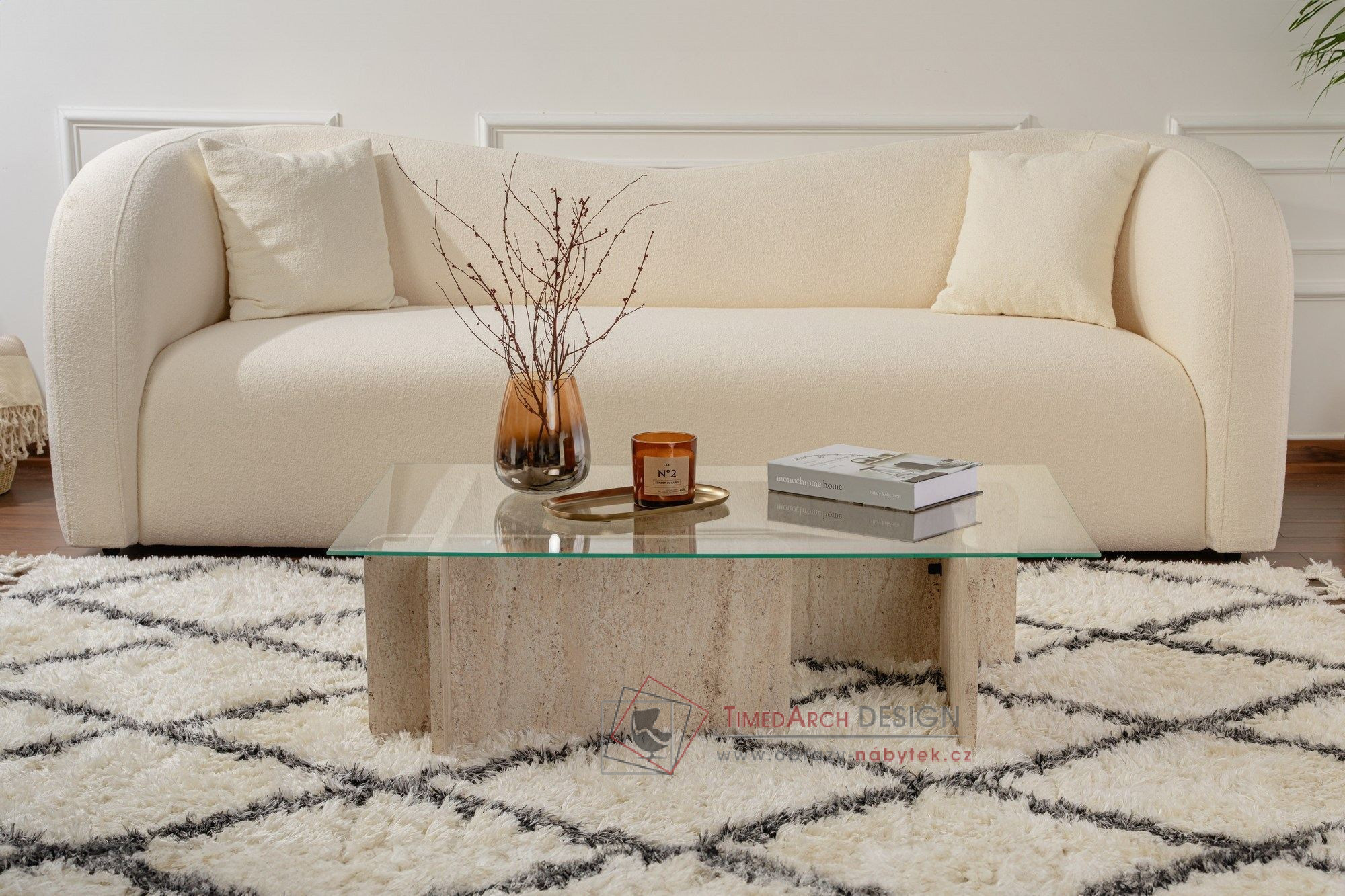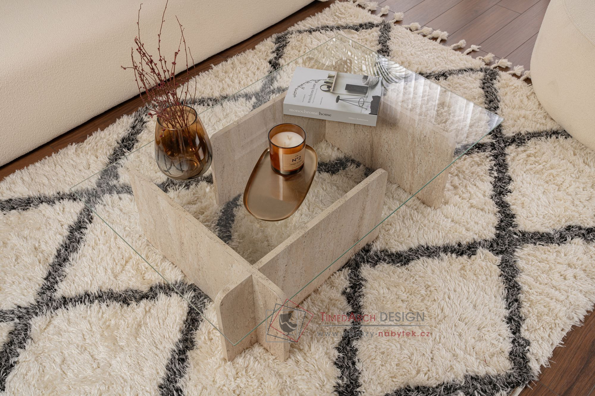 Proměňte svůj obytný prostor s úžasným konferenčním stolkem FLAVIO z travertinového mramoru.