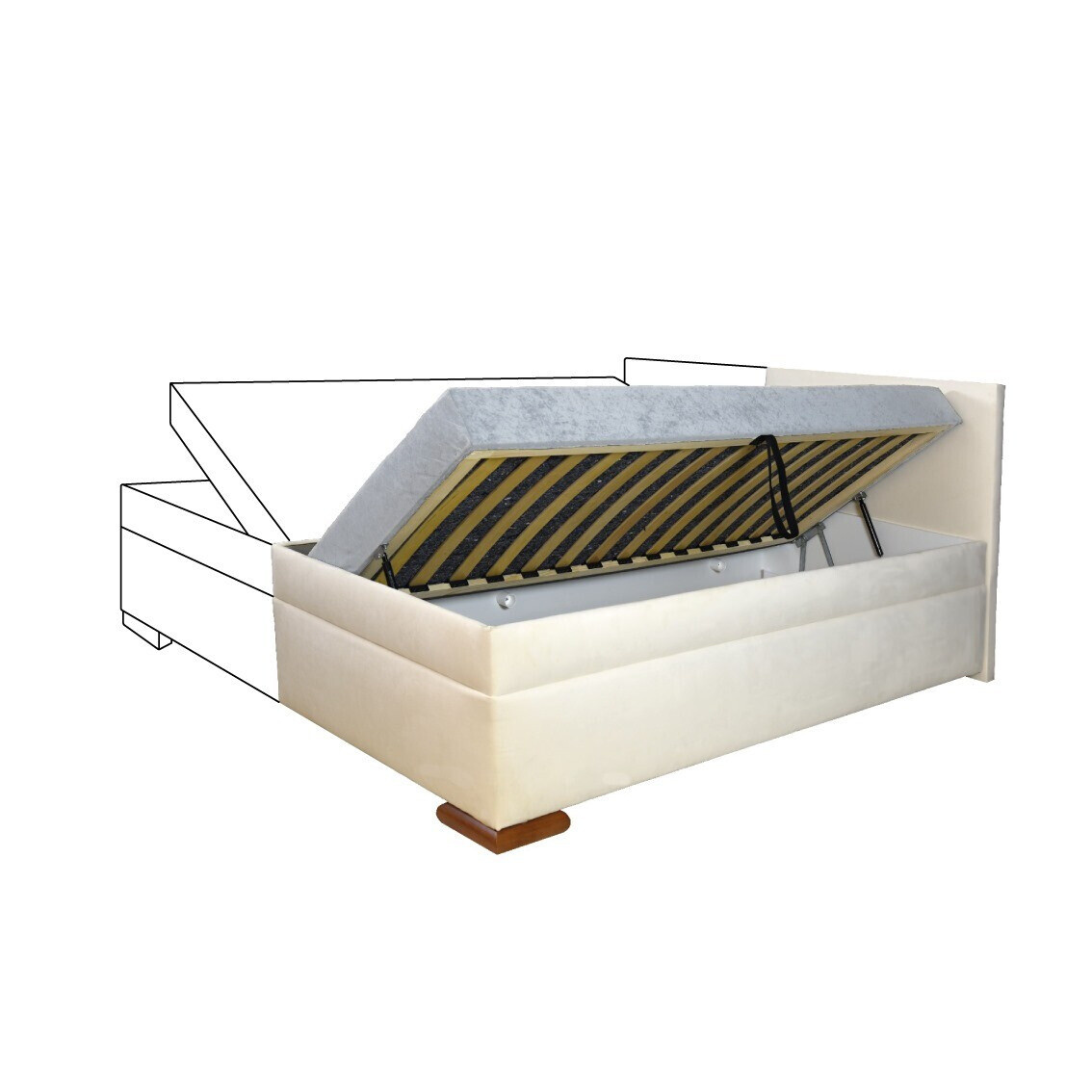 Box spring RIALTO má důmyslný systém odvětrávání a unikátní úložný prostor přístupný z boku nebo od nohou. V případě přístupu od nohou za pomocí plynových pístů je možnost polohování postelového roštu. Vysoké prošité postelové čelo. Výška lehací plochy dle výběru nožek a matrace, BEZ topperu 59-70 cm.