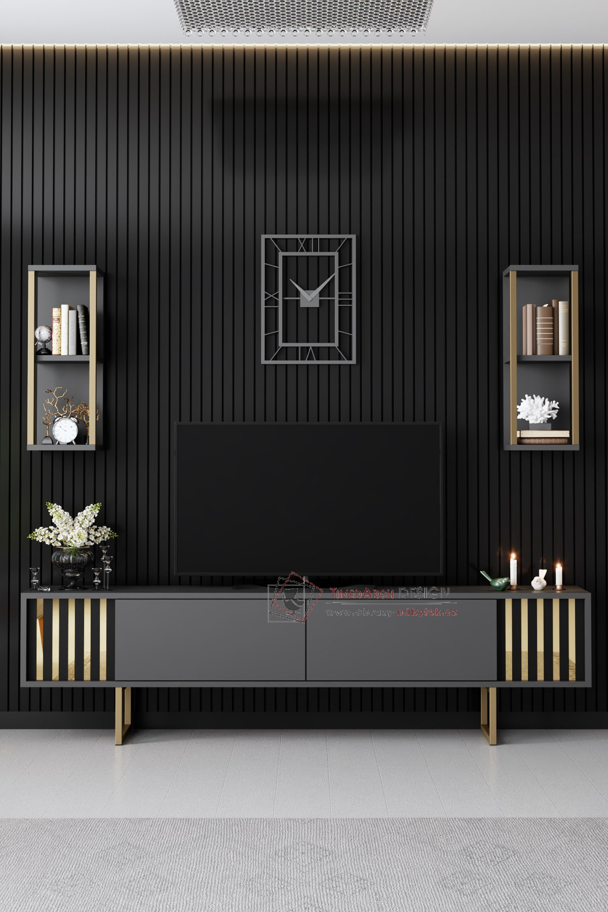 Obývací stěna je navržena ve stylové kombinaci antracitové a zlaté barvy, která dodá vašemu obývacímu pokoji nádech sofistikovanosti. Toto všestranné barevné schéma se bez námahy hodí k jakémukoli interiéru a stane se tak perfektním doplňkem vašeho domova.