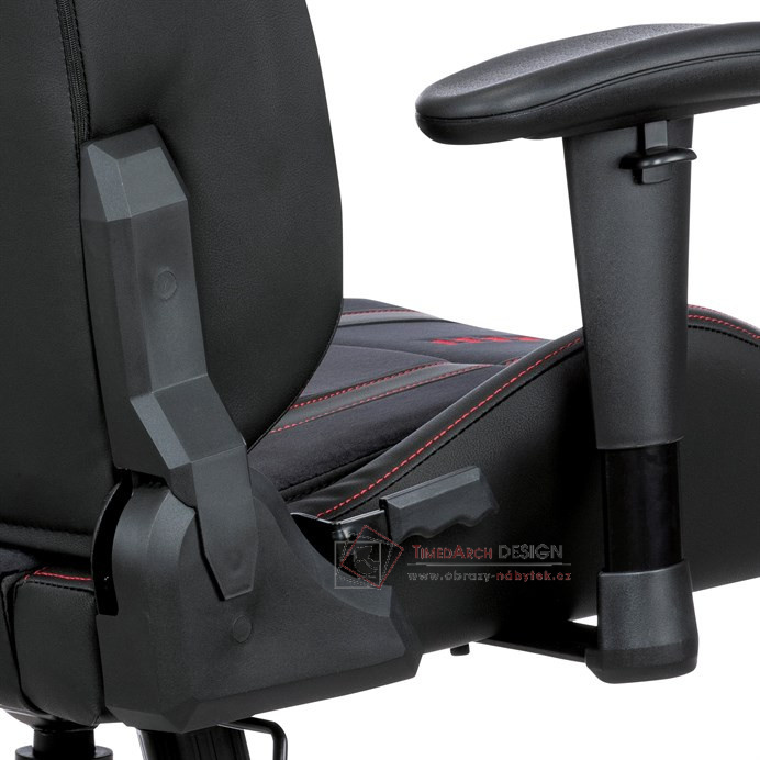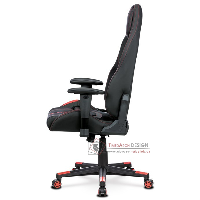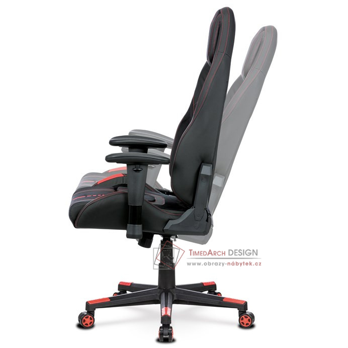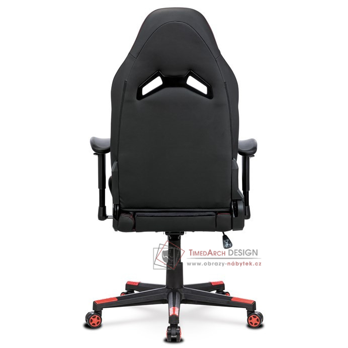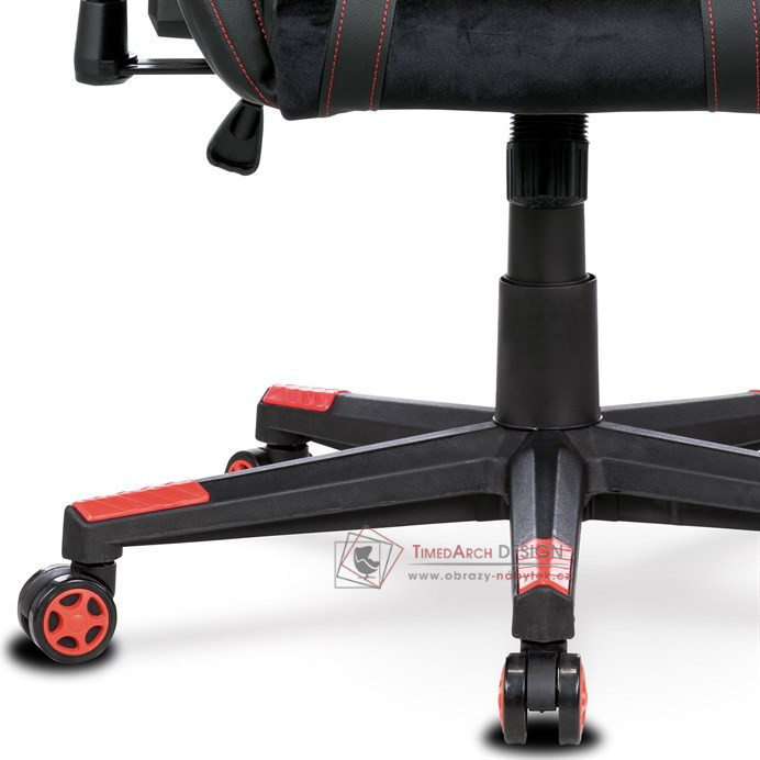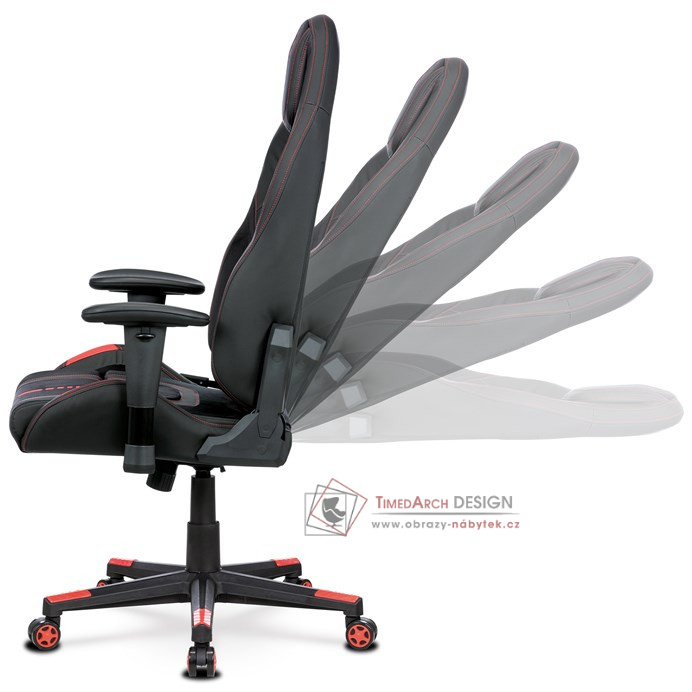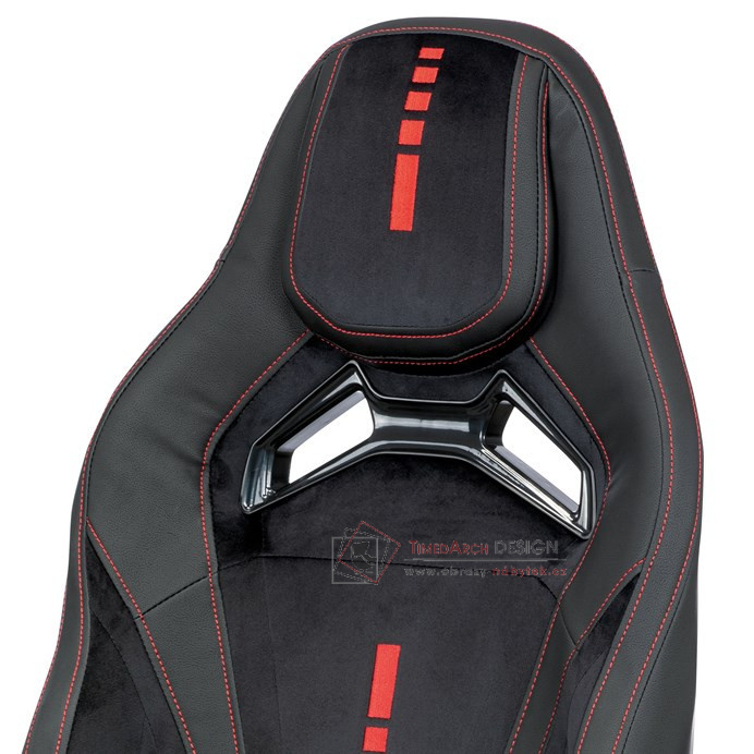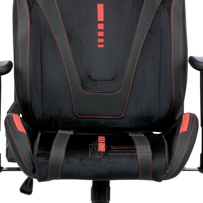 Jedná se o designové moderní křeslo, navržené nejen pro náročné požadavky PC hráčů, ale je uzpůsobené i pro standardní kancelářskou práci. To vše v maximálním pohodlí a při dokonalé ergonomii sezení. Potah je kombinací černé semišové látky a černé ekokůže s vyšívaným nápisem „eracer“. S výrazným červeným prošíváním celého křesla a červenými rychlými pruhy na sedáku i opěráku. Vnitřní rám je svařený z ohýbaných ocelových trubek a tvoří pevnou základnu pro celé křeslo. Výplň sedáku i opěráku je z kvalitní a tuhé PU pěny, vyztužení a pružnost zajišťují látkové popruhy s kovovým uchycením do konstrukce. Křeslo je vybaveno houpacím mechanismem. Síla houpání se reguluje plastovým šroubem pod sedákem. Výška sezení se upravuje páčkou na pravé straně přes kvalitní plynový píst. Masivní plastový kříž. Vysoký opěrák s integrovanou zesílenou opěrkou hlavy a bočním vedením slouží nejen jako výborná opora celých zad a podporuje správné držení páteře, ale je možné nastavit jeho sklon od 90°až do 180° a to v jakékoli poloze. K ovládání slouží mechanismus s páčkou umístěný na pravé straně. 2D područky jsou s měkkým povrchem, výškově stavitelné a s natáčecí opěrkou. Nosnost židle je až 130 kg. Herní křesla z kolekce Eracer jsou skvělou volbou, ať je zaparkujete za hrací či kancelářský stůl. Vždy působí dominantně, jako nepřehlédnutelný solitér. Kvalita zpracování, důraz na pohodlí a ergonomii, to zaručuje pohodu při dlouhých herních večerech i denní kancelářské práci. A jako bonus, ke krátkodobému odpočinku můžete využít opěrák, sklopený téměř do horizontální polohy.