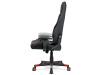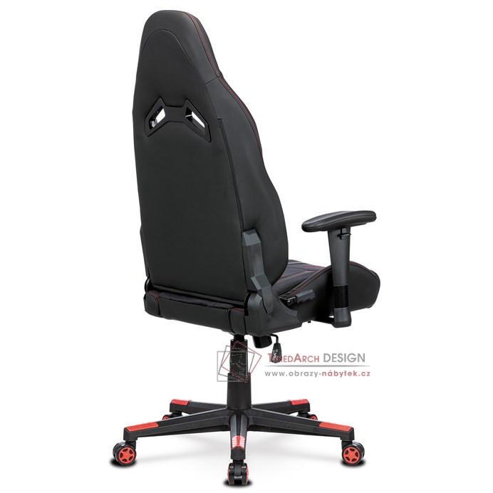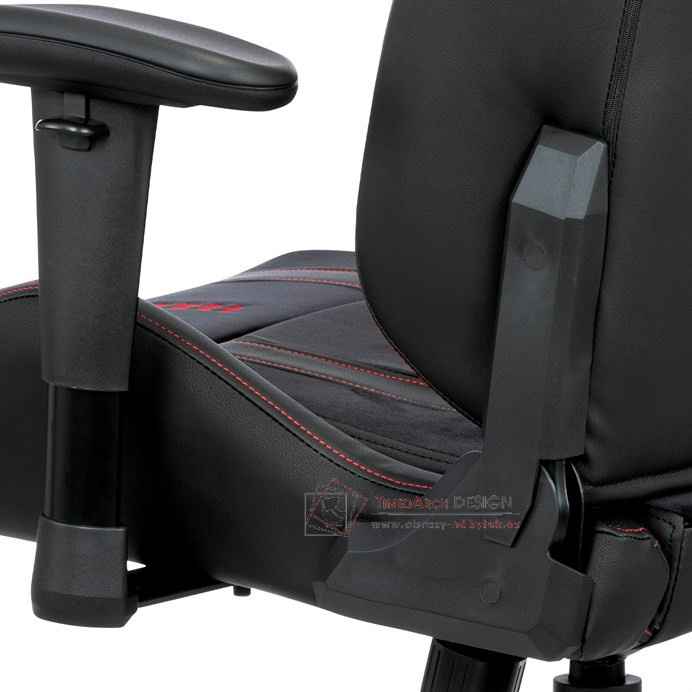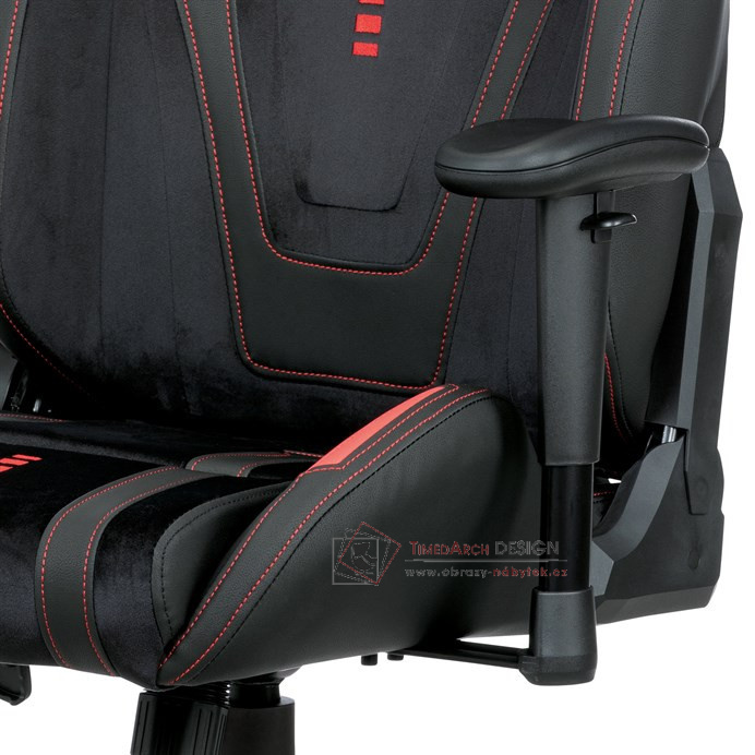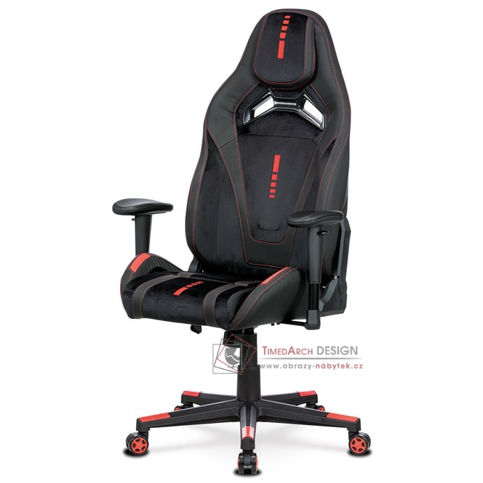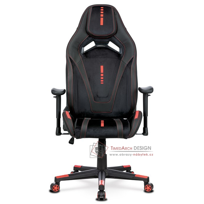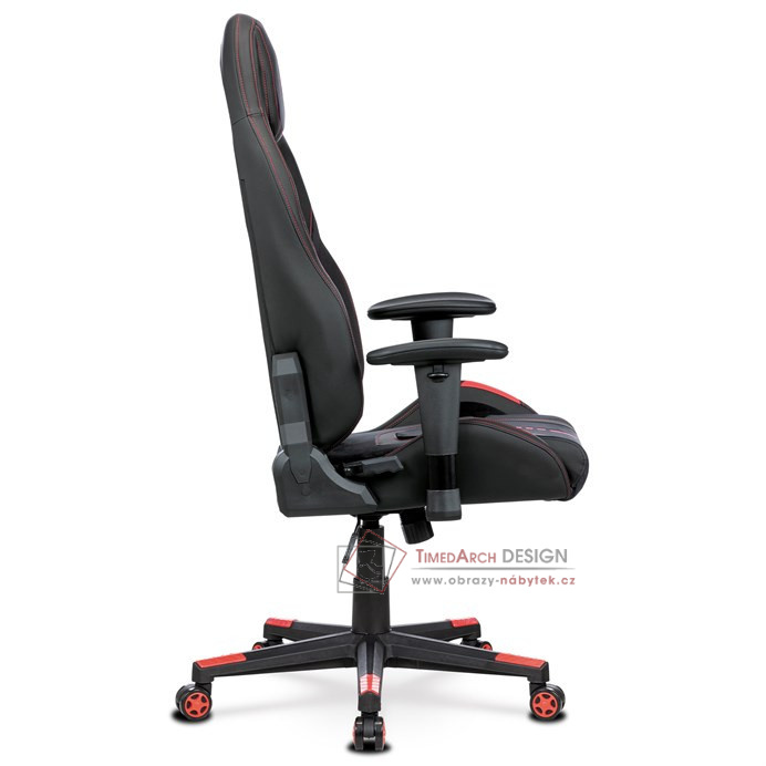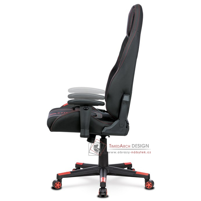 Jedná se o designové moderní křeslo, navržené nejen pro náročné požadavky PC hráčů, ale je uzpůsobené i pro standardní kancelářskou práci. To vše v maximálním pohodlí a při dokonalé ergonomii sezení. Potah je kombinací černé semišové látky a černé ekokůže s vyšívaným nápisem „eracer“. S výrazným červeným prošíváním celého křesla a červenými rychlými pruhy na sedáku i opěráku. Vnitřní rám je svařený z ohýbaných ocelových trubek a tvoří pevnou základnu pro celé křeslo. Výplň sedáku i opěráku je z kvalitní a tuhé PU pěny, vyztužení a pružnost zajišťují látkové popruhy s kovovým uchycením do konstrukce. Křeslo je vybaveno houpacím mechanismem. Síla houpání se reguluje plastovým šroubem pod sedákem. Výška sezení se upravuje páčkou na pravé straně přes kvalitní plynový píst. Masivní plastový kříž. Vysoký opěrák s integrovanou zesílenou opěrkou hlavy a bočním vedením slouží nejen jako výborná opora celých zad a podporuje správné držení páteře, ale je možné nastavit jeho sklon od 90°až do 180° a to v jakékoli poloze. K ovládání slouží mechanismus s páčkou umístěný na pravé straně. 2D područky jsou s měkkým povrchem, výškově stavitelné a s natáčecí opěrkou. Nosnost židle je až 130 kg. Herní křesla z kolekce Eracer jsou skvělou volbou, ať je zaparkujete za hrací či kancelářský stůl. Vždy působí dominantně, jako nepřehlédnutelný solitér. Kvalita zpracování, důraz na pohodlí a ergonomii, to zaručuje pohodu při dlouhých herních večerech i denní kancelářské práci. A jako bonus, ke krátkodobému odpočinku můžete využít opěrák, sklopený téměř do horizontální polohy.