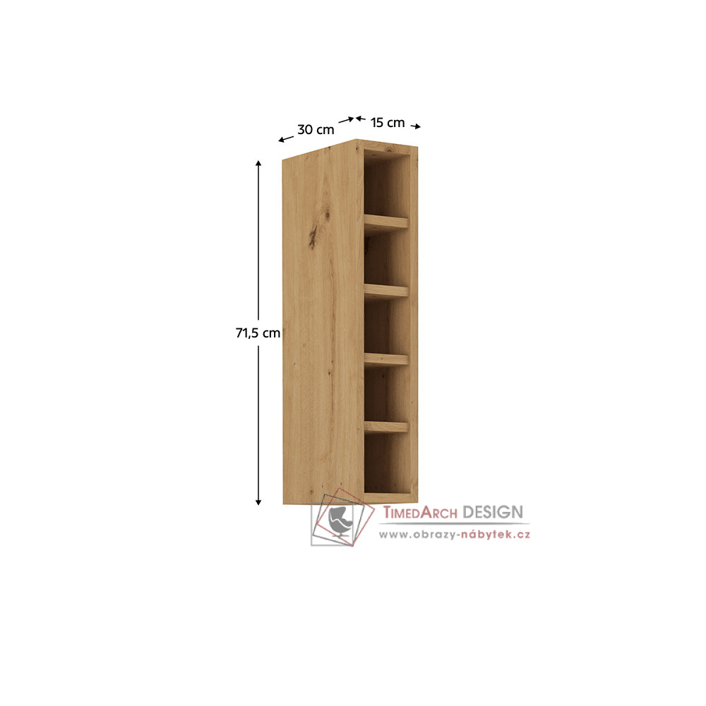 Horní skříňka Monrovia 15 G-72 OTW je bez dvířek. Celá je v provedení dub artisan. Vnitřek skříně je se 4-mi policemi.