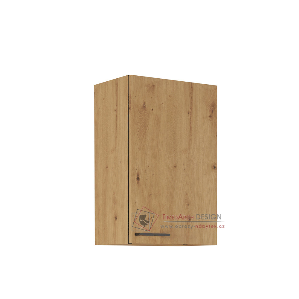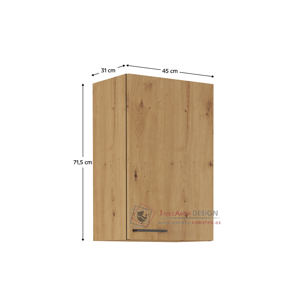 Horní skříňka Monrovia 45 G-72 1F je s dvířky. Celá skříňka je v provedení dub artisan. Vnitřek skříně je bílý. Dvířka se otevírají pomocí úchytky. Vyniká také tichým dorazem dvířek.