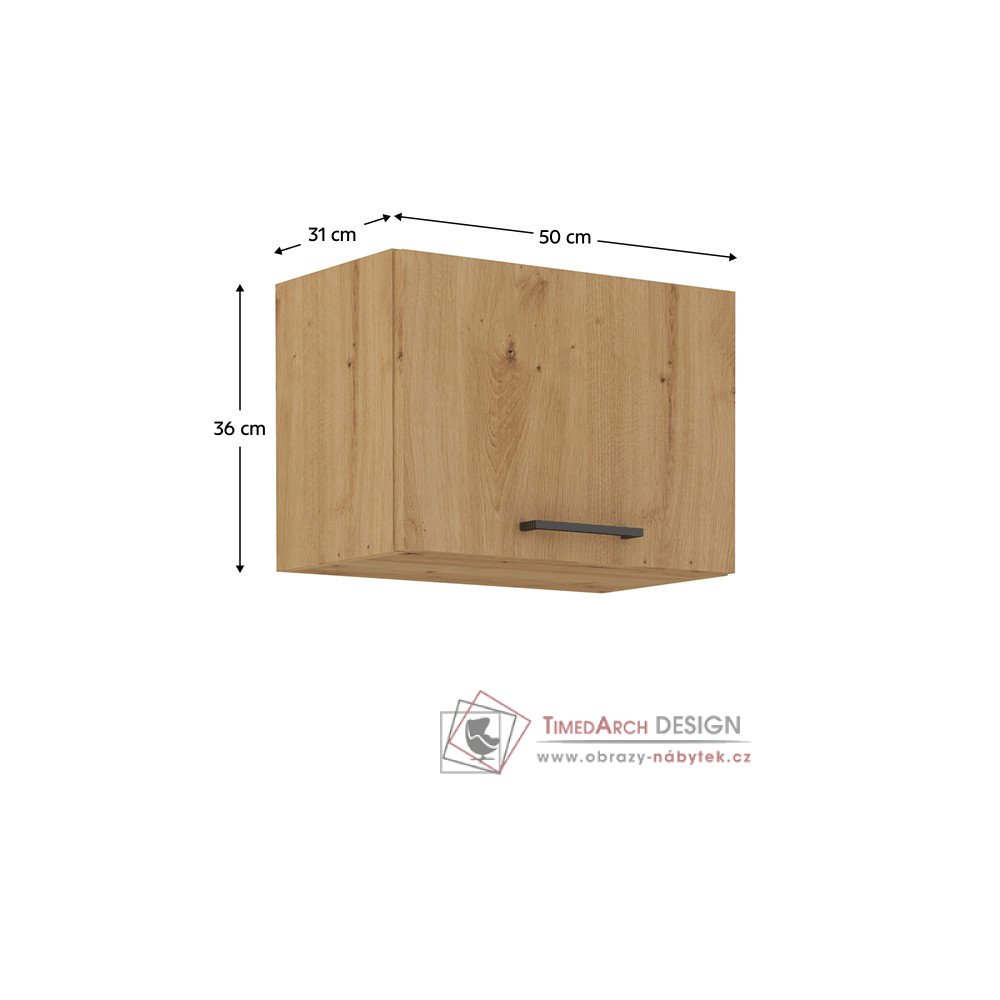 Horní skříňka Monrovia 50 GU-36 1F je s dvířky. Celá skříňka je v provedení dub artisan. Vnitřek skříně je bílý. Dvířka se otevírají pomocí úchytky. Vyniká také tichým dorazem dvířek.