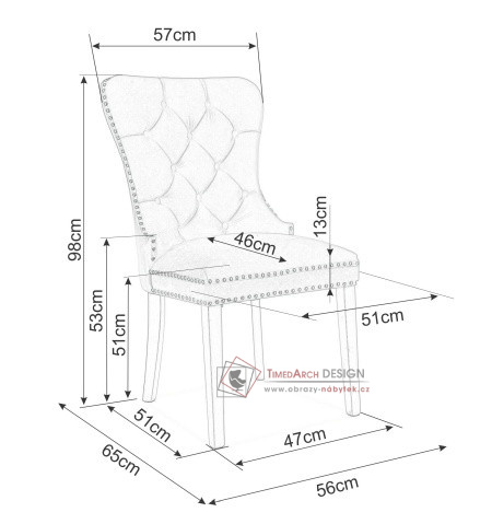 Podnož z dřevěného masivu je černé barvy. Čalounění sedáku a opěráku aksamitovou látkou barvy šedé (Bluvel 14). Kovové zdobení po obvodu a na zádech židle.