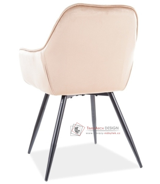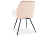Podnož jídelního křesla je kovová černé barvy. Čalounění židle látkou aksamit typu Velvet barvy starorůžová.