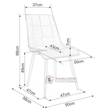 Podnož židle je kovová v provedení černý lak. Čalounění sedáku a opěráku aksamitovou látkou barvy černé.