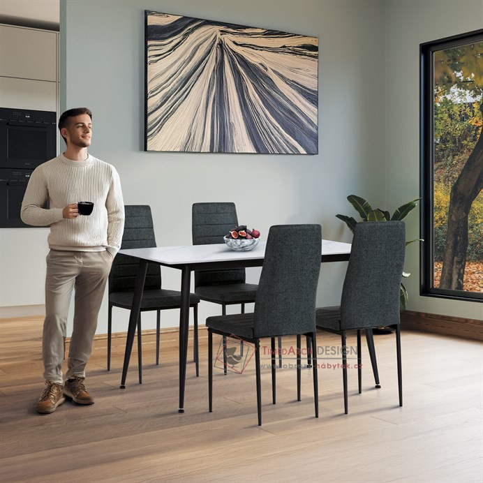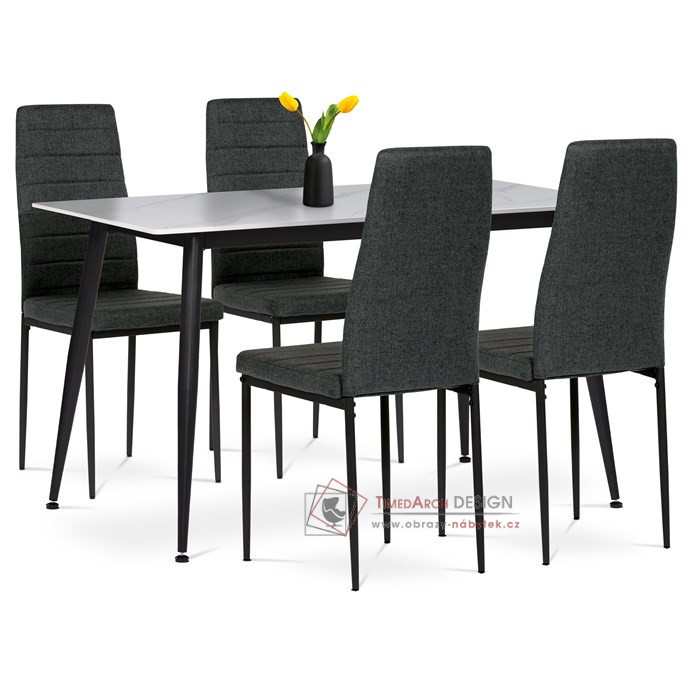Obdélníkový stůl s deskou ze slinuté keramiky v bílém mramorovém dekoru působí elegantně a je odolný vůči poškrábání. Stabilitu zajišťují černé kovové nohy s jemně kónickým tvarem. Pohodlné židle mají čalounění z hladké černé látky a ergonomicky tvarovanou opěrku pro maximální komfort. Černé kovové nohy ladí se stolem a dodávají celku jednotný vzhled. Ideální volba pro stylové a funkční stolování.