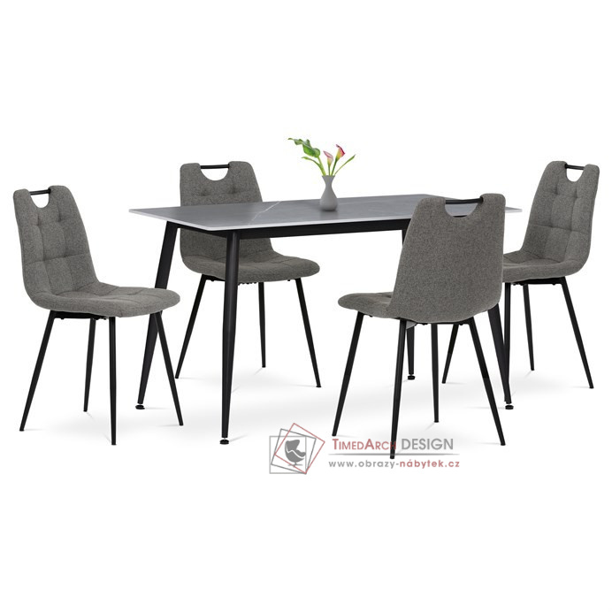 Obdélníkový stůl s deskou ze slinuté keramiky v imitaci šedého mramoru dodá jídelně luxusní nádech, zatímco stabilní kovové nohy v černém provedení zajistí pevnost a odolnost. Čtyři pohodlné židle čalouněné šedou látkou s měkkým polstrováním zaručují maximální komfort při sezení. Stylový detail v podobě černého madla na opěradle usnadňuje manipulaci. Ideální volba pro moderní interiéry, kde se snoubí praktičnost s nadčasovým designem.