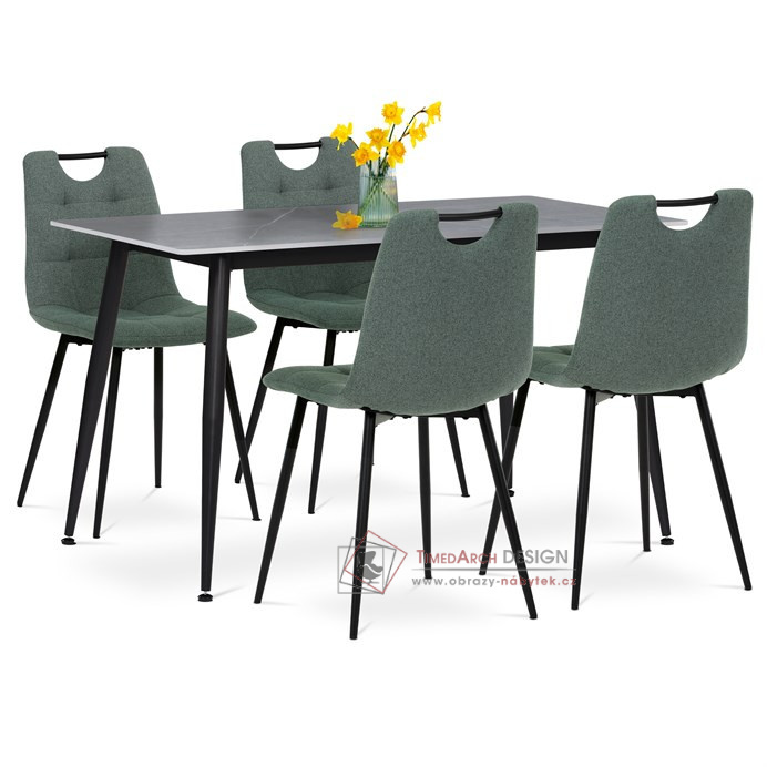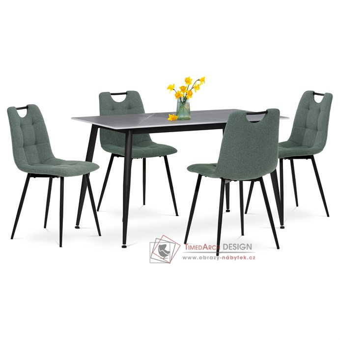 Obdélníkový stůl s deskou ze slinuté keramiky v imitaci šedého mramoru dodá jídelně luxusní nádech, zatímco stabilní kovové nohy v černém provedení zajistí pevnost a odolnost. Čtyři pohodlné židle čalouněné zelenou látkou s měkkým polstrováním zaručují maximální komfort při sezení. Stylový detail v podobě černého madla na opěradle usnadňuje manipulaci. Ideální volba pro moderní interiéry, kde se snoubí praktičnost s nadčasovým designem.