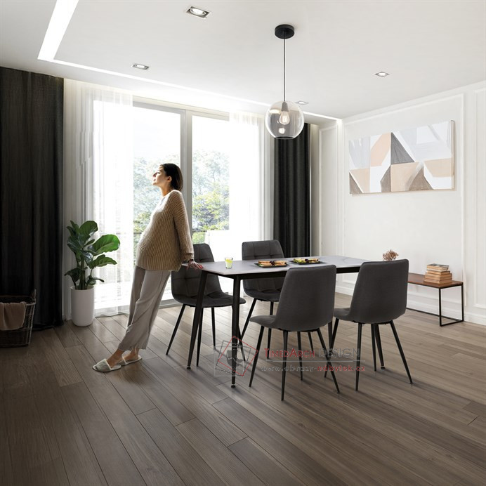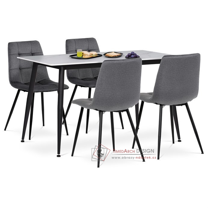 Stůl o rozměrech 130x80 cm je vybaven deskou z kvalitní slinuté keramiky s bílým mramorovým dekorem, která je odolná vůči poškrábání a snadno se udržuje. Černá kovová podnož stolu zajišťuje stabilitu a pevnost celé sestavy. Čtyři židle jsou čalouněné šedou látkou s designovým prošitím na opěradle, které dodává celku elegantní a současný vzhled. Židle mají kovové nohy v černé barvě, které doplňují celkový minimalistický styl a poskytují dostatečnou nosnost pro běžné použití.